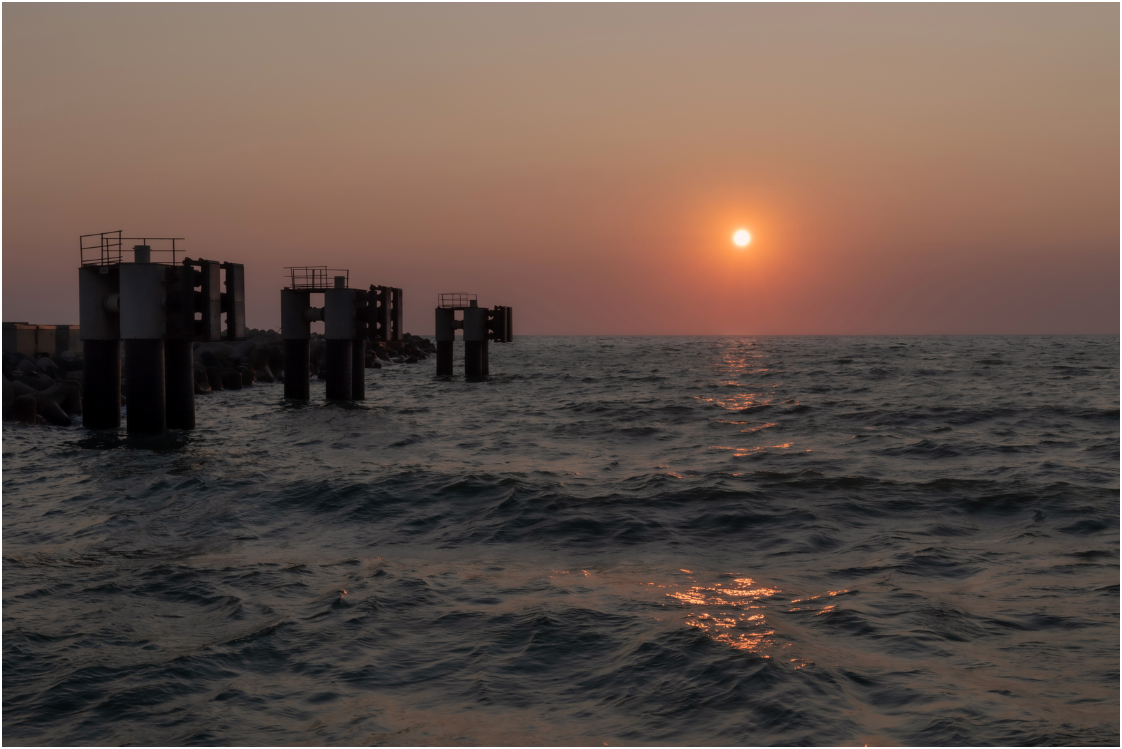 Buona composizione, il sole e il suo riflesso sono ben bilanciati dalle strutture e dal molo.