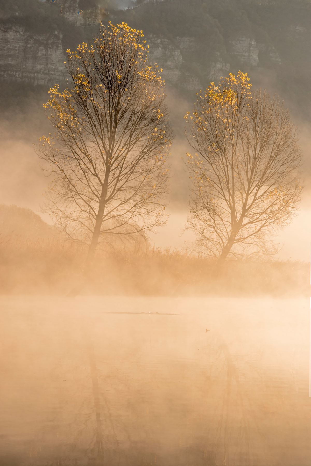 che meraviglia questi due alberi che si ergono dalla foschia e sembrano difendere le ultime foglie dorate che ancora adornano le loro cime