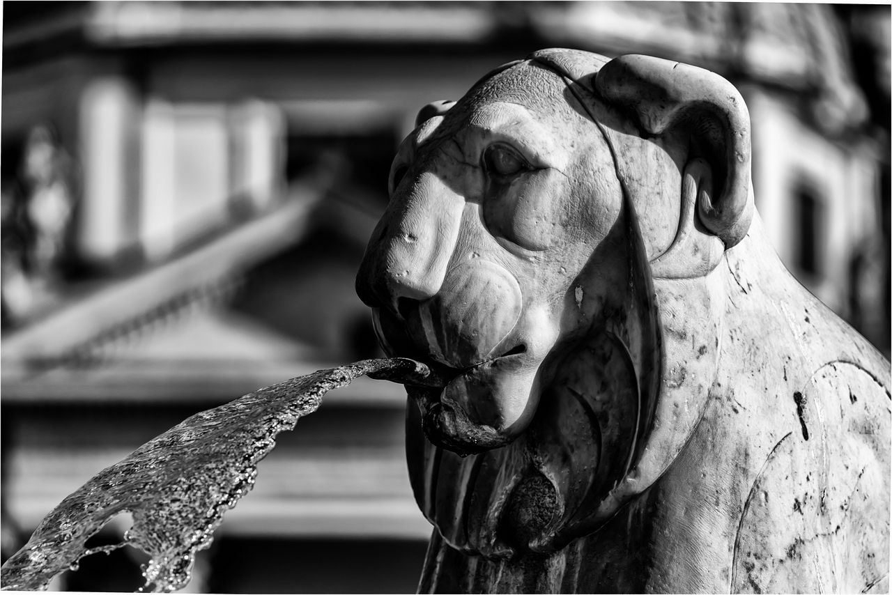 Molto ben vista,suggestivo il particolare dell'acqua che zampilla dalla bocca di questa ,uhm,figura mitologica? L'hai lavorata bene,tirando su quel tanto che basta l'ombra sull'occhio per non perdere il dettaglio ,buona la scelta del diaframma che rende un minimo leggibile lo sfondo e quindi il contesto "classico" della foto. Piacevole il BN, un filo piu' tagliente rispetto alle tue lavorazioni precedenti.