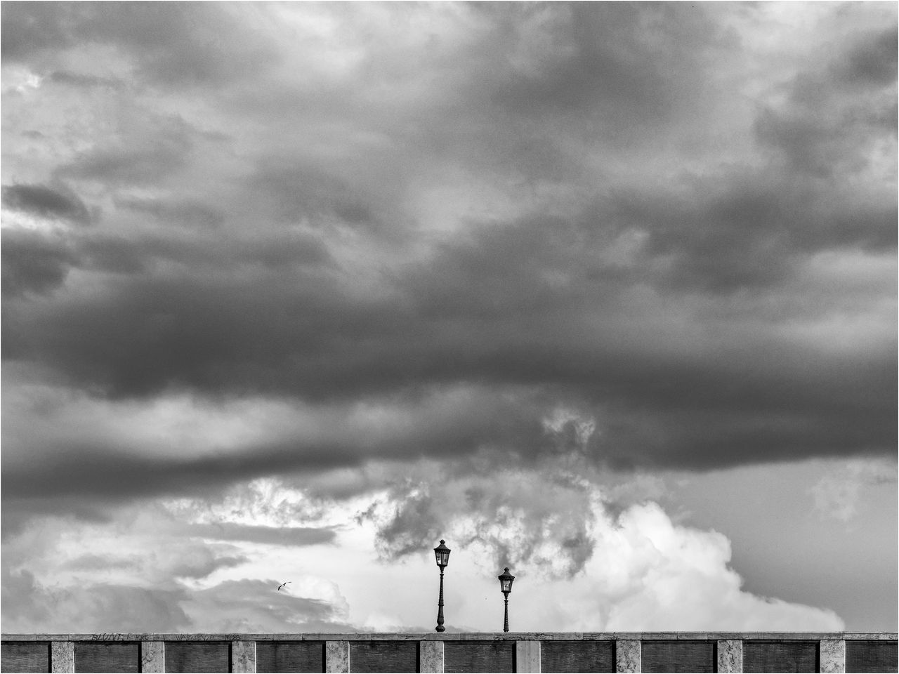 Un minimalismo spinto molto interessante e intrigante… Mi piace l’aspetto geometrico di muro e lampioni contrapposto al turbinio del cielo e trovo adeguato il bn Molto bravo!