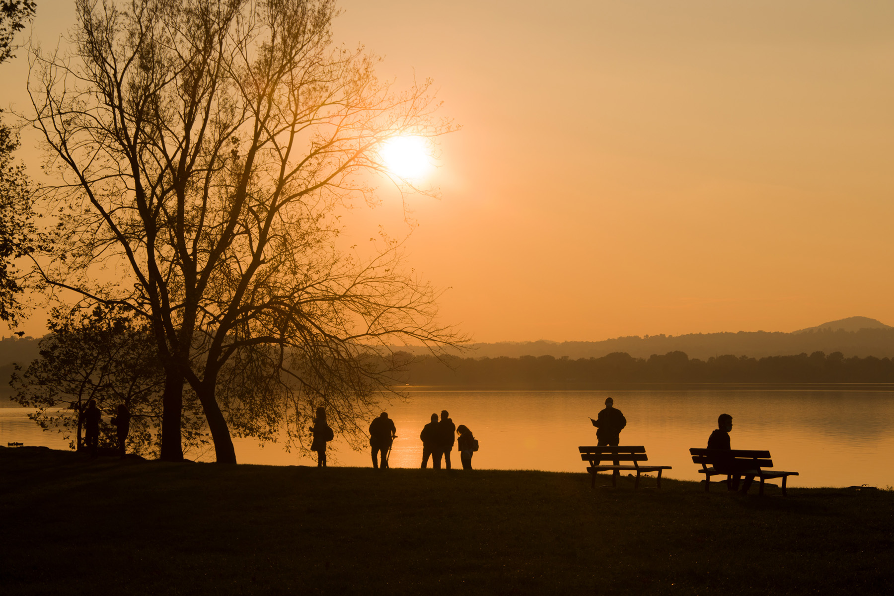 | Un colore arancio leggermente passito per questa dispersione di luce al tramonto fa da perfetto fondale alle silhouette delle persone intente a godersi gli attimi a bordo lago. Immagine evocativa e romantica. Ciao, Tiziano |