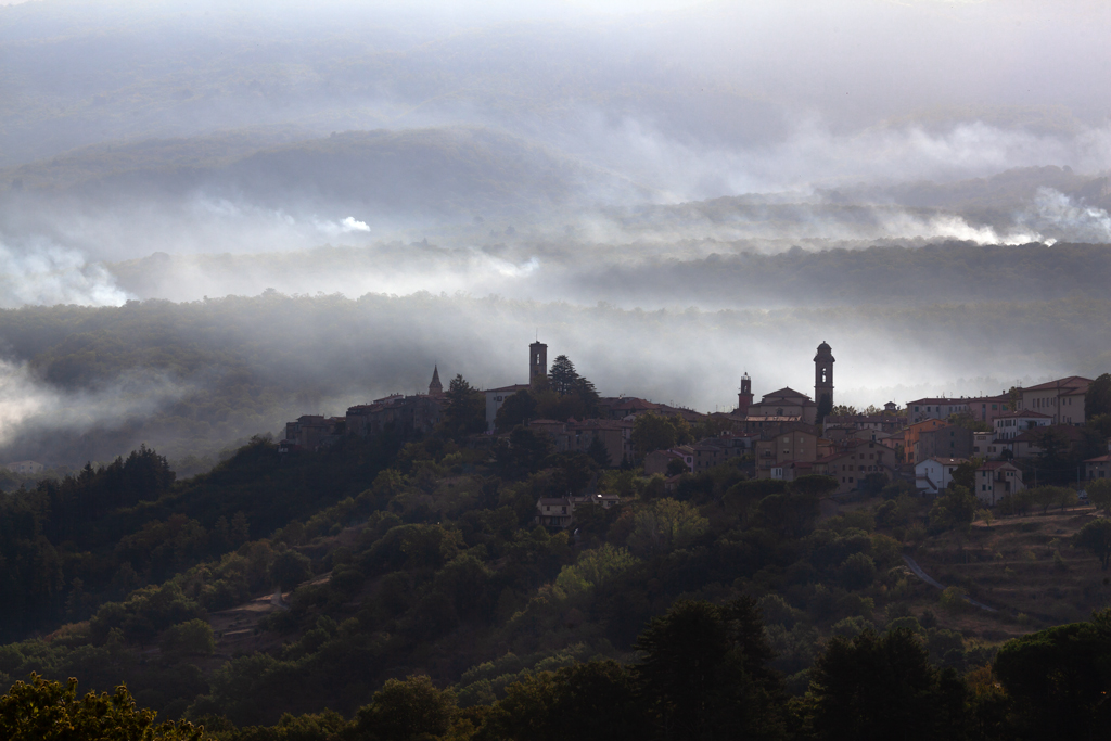 L'incendio che avvolge le dolce colline le ha rese quasi spettrali. Anche il borgo sottoesposto da l'idea di essere in pericolo. Interessante scatto