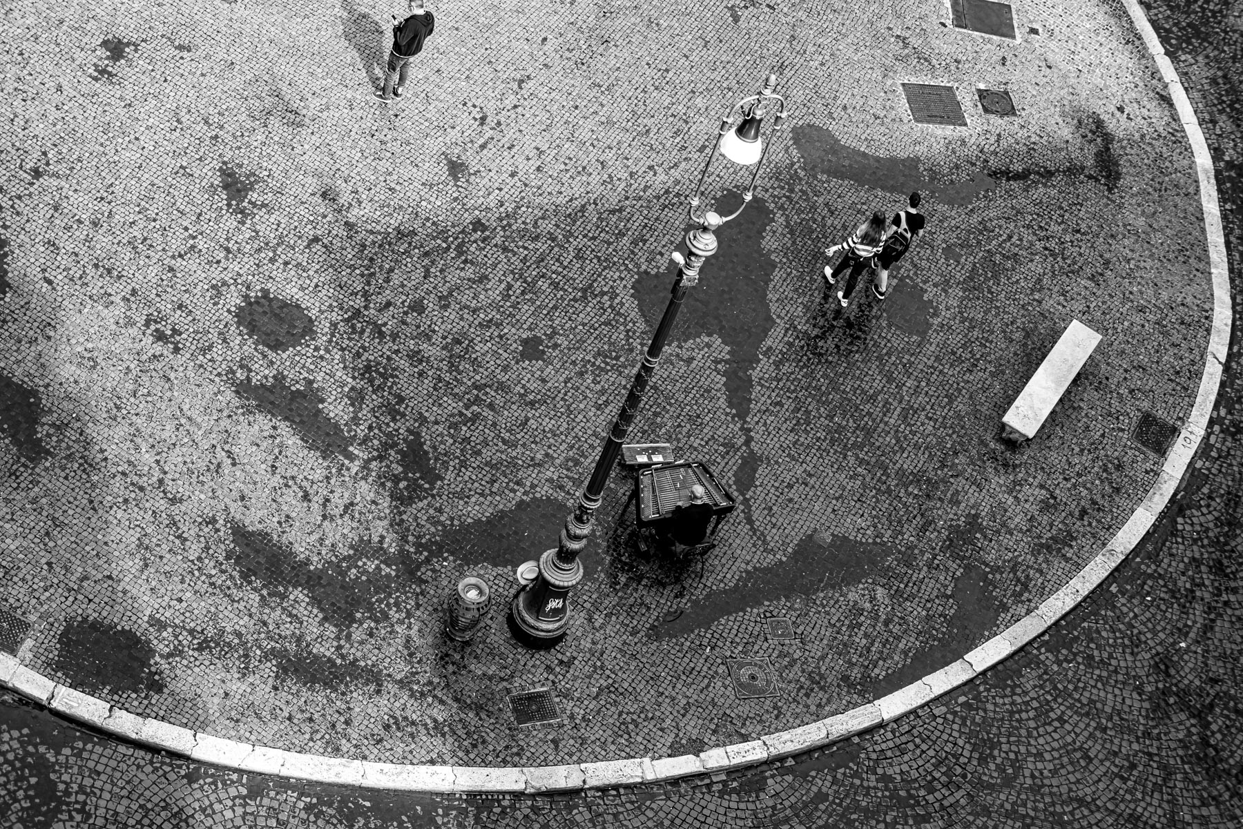 Quel pezzettino di testa mancante in alto è poco ma sciupa un attimino la validità dello scatto ben racchiuso nella sua scena di vita di strada nella virgola a cerchio che delimita questa piazzetta. Il bianco e nero è buono come toni. Mi piace. Ciao, Tiziano