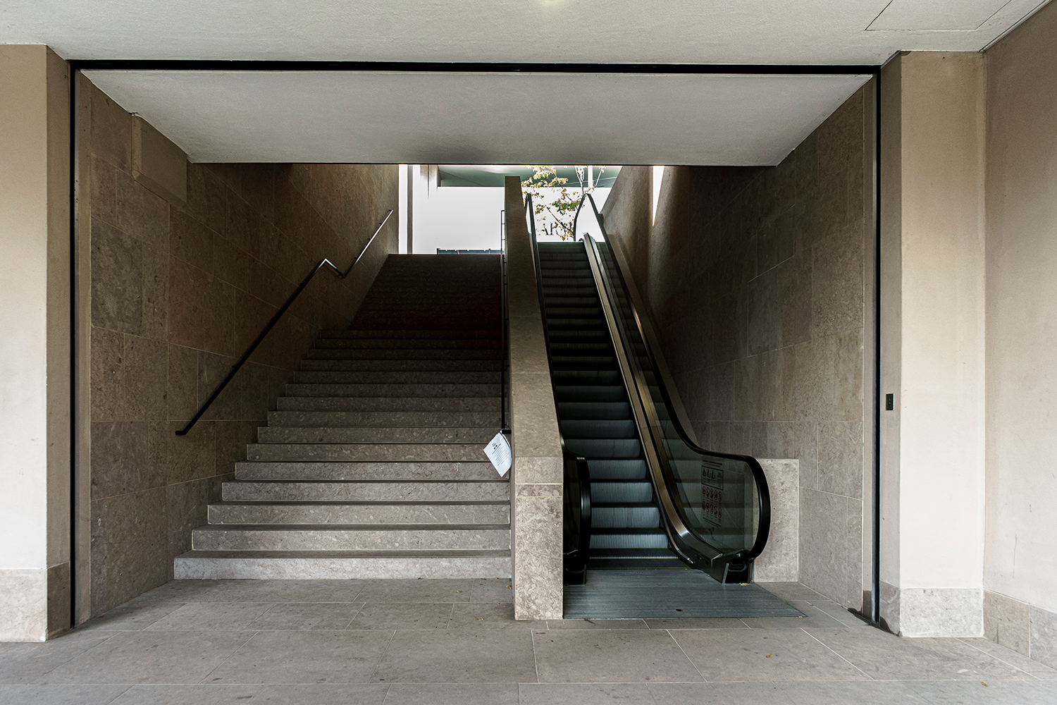 Ripresa rigorosa che evidenzia le geometrie del vano scale. Precisa la chiusura a destra. Una possibile alternativa, un leggero taglio a destra, tenendo simmetrica la cornice nera. Ben vista