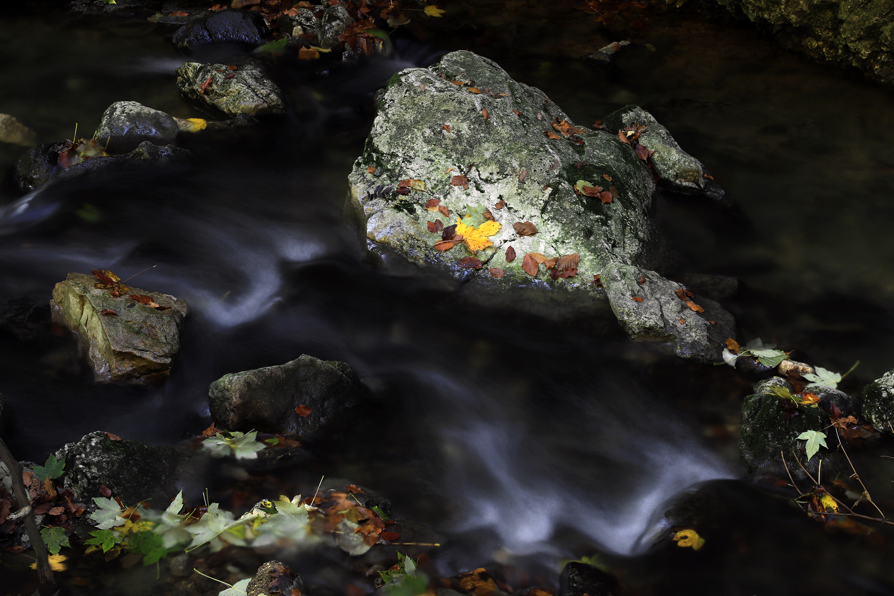 Le foglie statiche che vanno a fare da cornice alla dinamicità dell'acqua. Bella immagine.