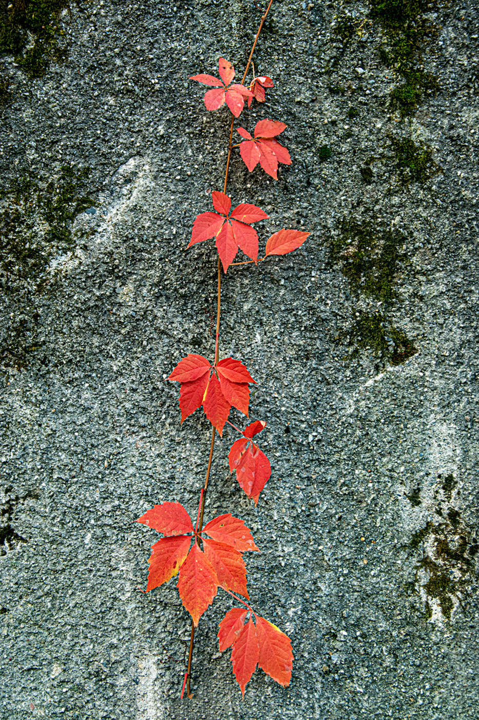 Dettagli d'autunno, belli il rosso squillante dell'edera stacca bene con il grigio dello sfondo