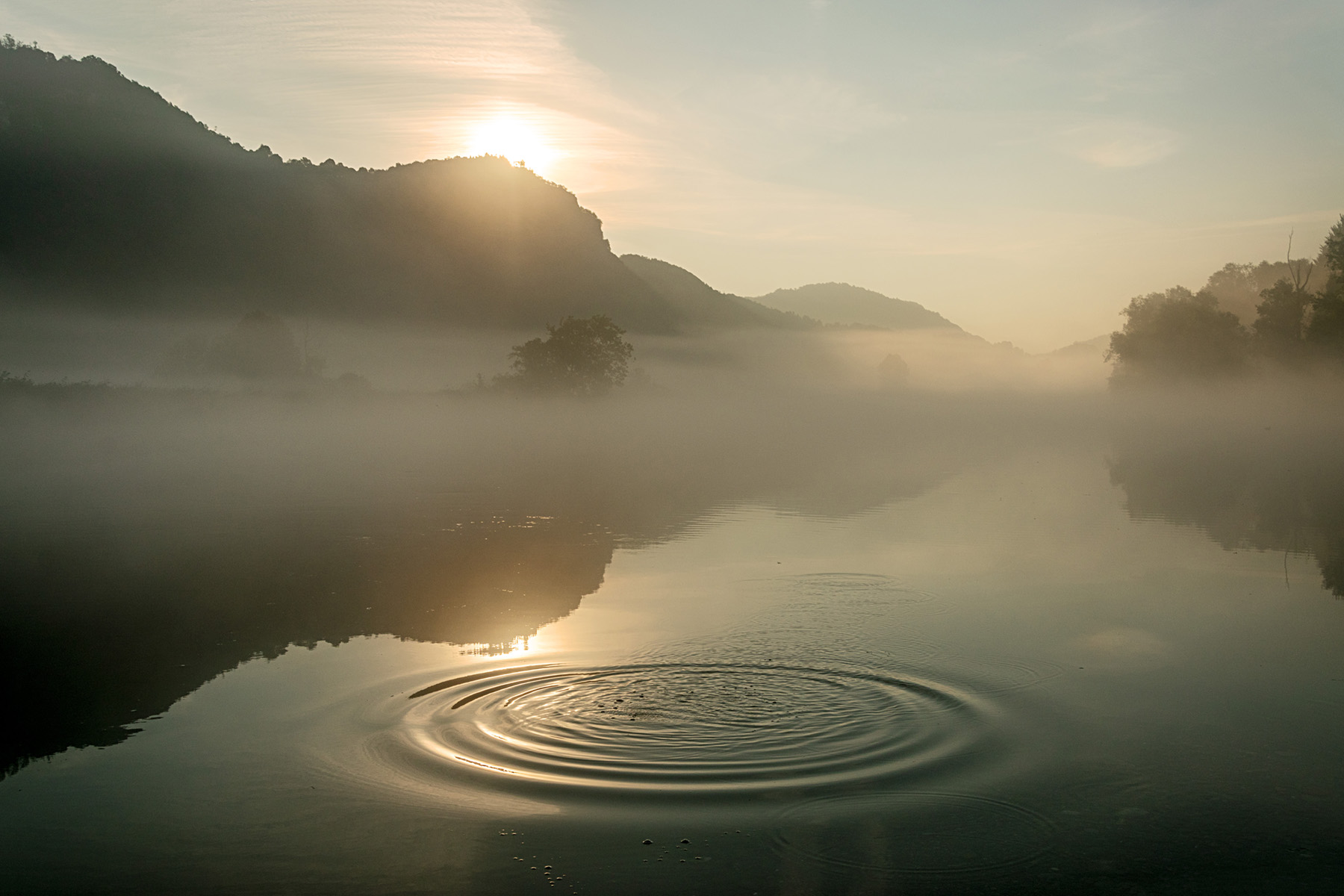 | Un'atmosfera nebbiosa quasi fumosa con una soave dispersione di luce sulla scena essenziale da te ripresa. Il colpo forte dell'immagine è poi quel giro di anelli forse provocato dalla scodata di un pesce che riempe di interesse la parte inferiore del fotogramma e rilascia una sensazione vitale in un paesaggio che poetva apparire addirittura incantato. bella. Ciao, Tiziano |
