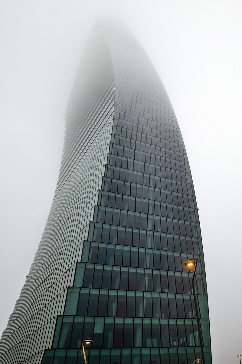 | I due lampioni a guardia della struttura che, in equilibrio instabile, in altezza si perde nella nebbia .Bella e ben realizzata immagine |