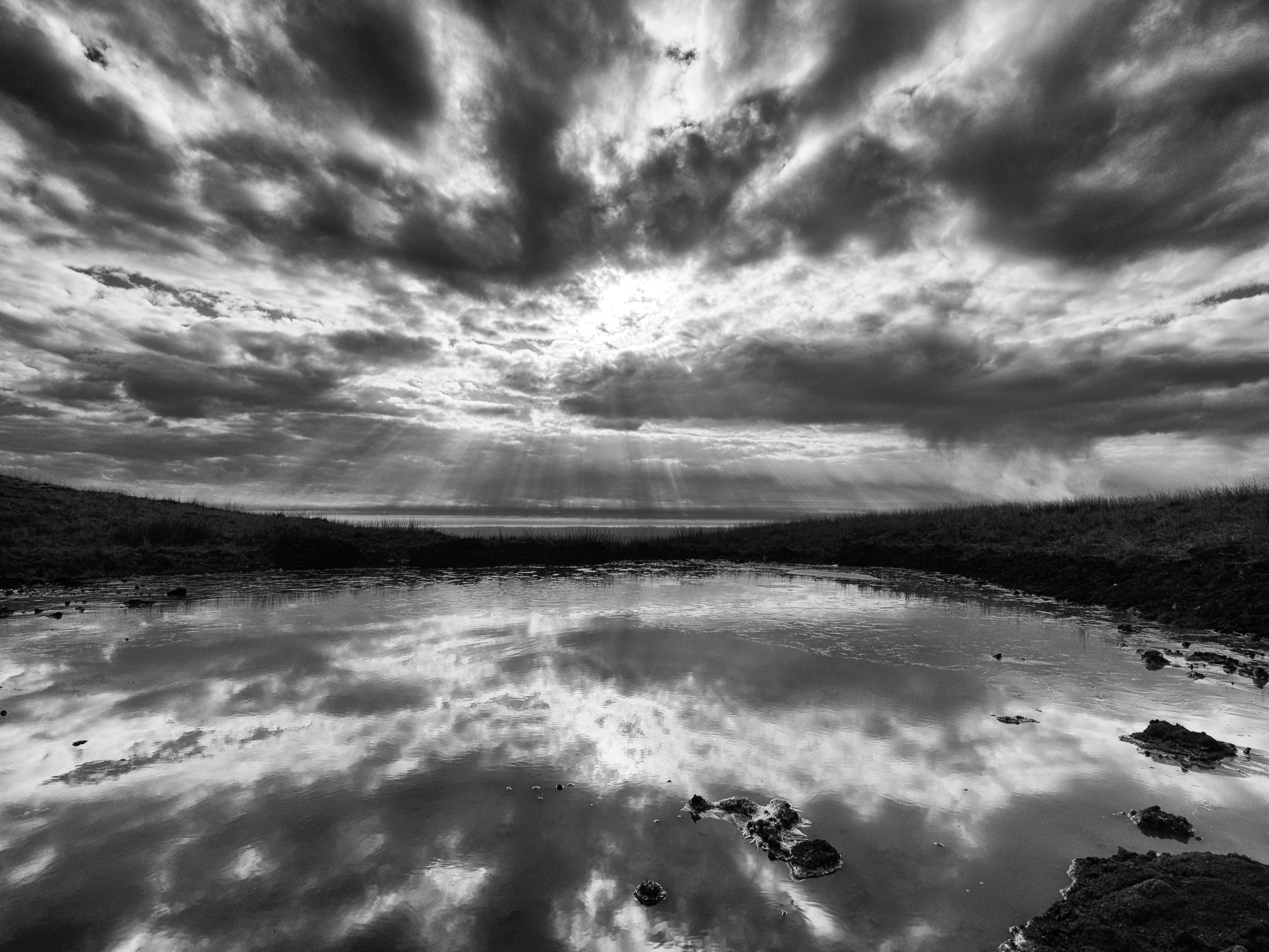 Un'esplosione di luce filtrata dalle nubi, bello anche il riflesso.