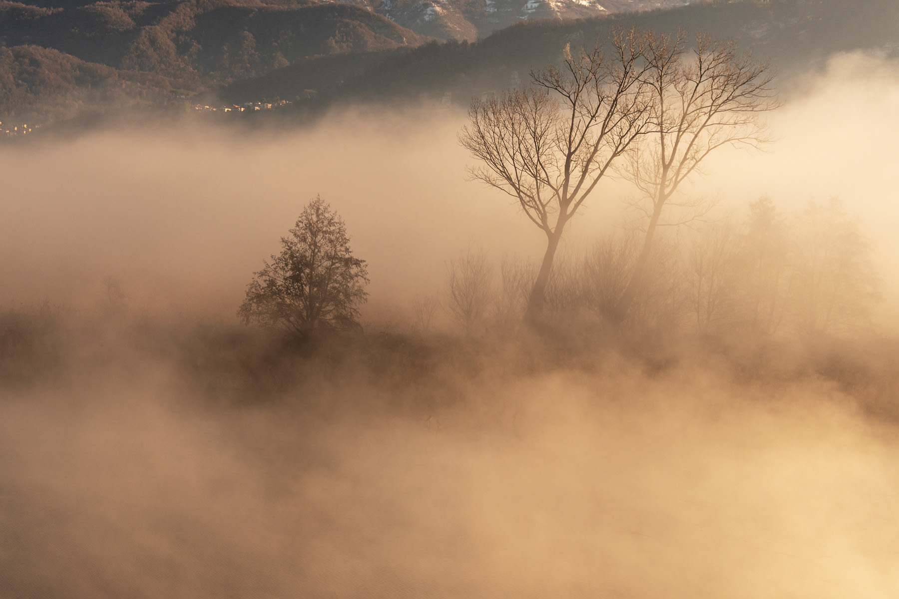 Atmosfera suggestiva con quei alberelli che emergono dalla nebbia mentre in prospettiva il sole illumina l'agglomerato delle case e i profili montuosi. Una buona proposta