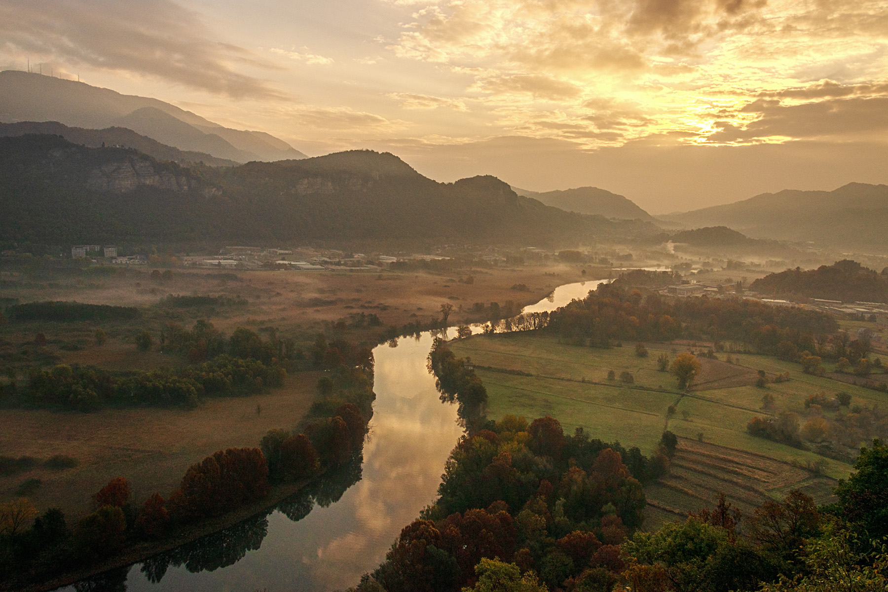 Il fiume con ai lati i bei colori autunnali ci conduce ad un amplio panorama fatto dalle sinuose linee di monti. Una lieve foschia attenua la vivacità dei colori ma la suggestione della vista rimane immutata. Ottima proposta _________________ Giuseppe |