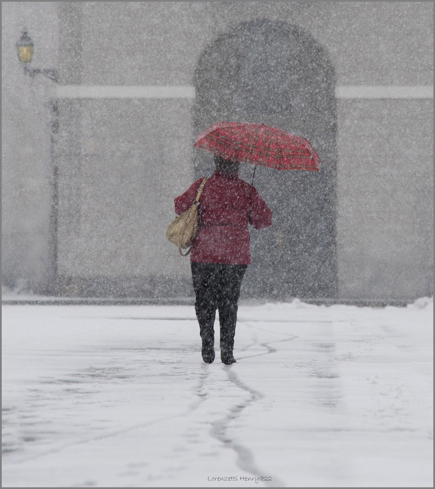 un'immagine che trasmette molto bene l'atmosfera di una giornata nevosa, l'ombrello e la giacca della signora regalano un tocco di colore. Mi piace molto