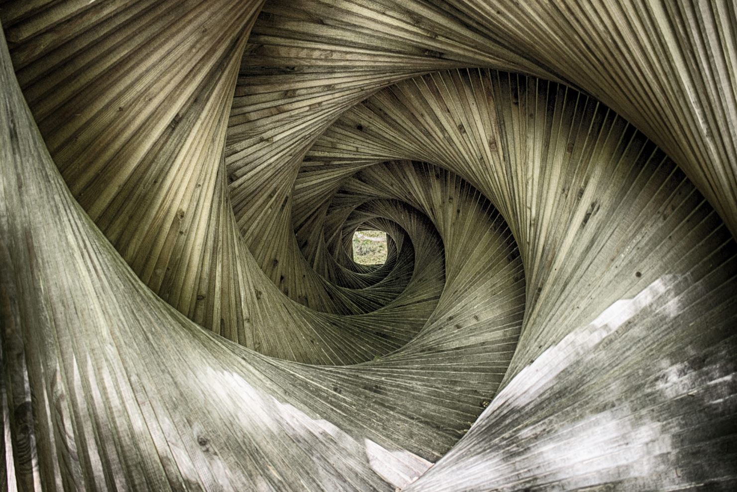 un lavoro ligneo di livello, si è attratti dalla luce centrale in questa spirale vorticosa di linee