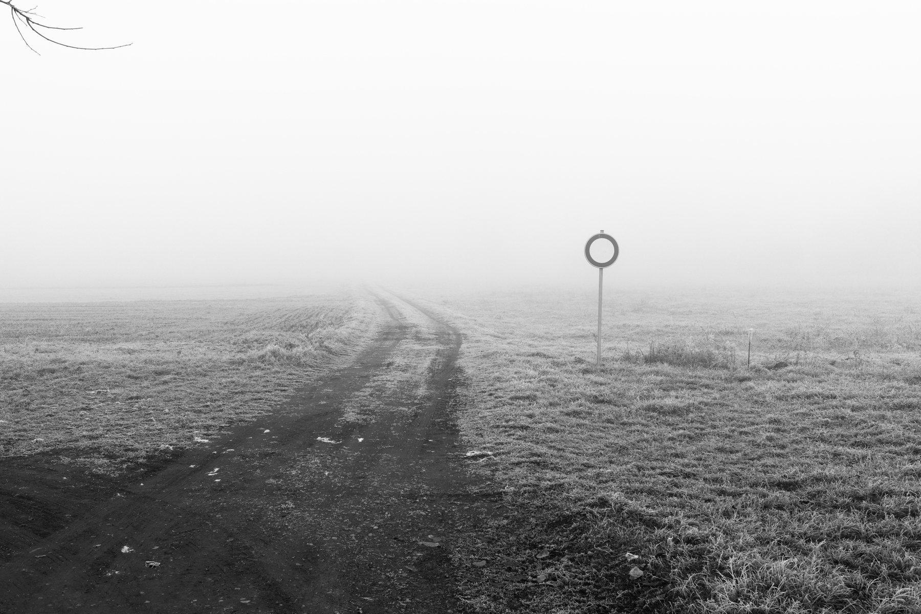 Il cartello solitario sembra un bersaglio perso nell'immensità della bassa, la foschia isola a dovere il soggetto.