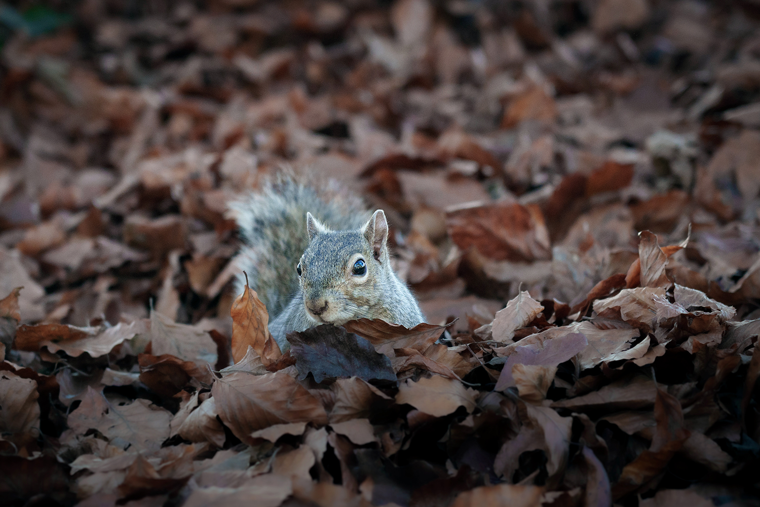 Molto bello questo scoiattolo che sbuca dal fogliame.