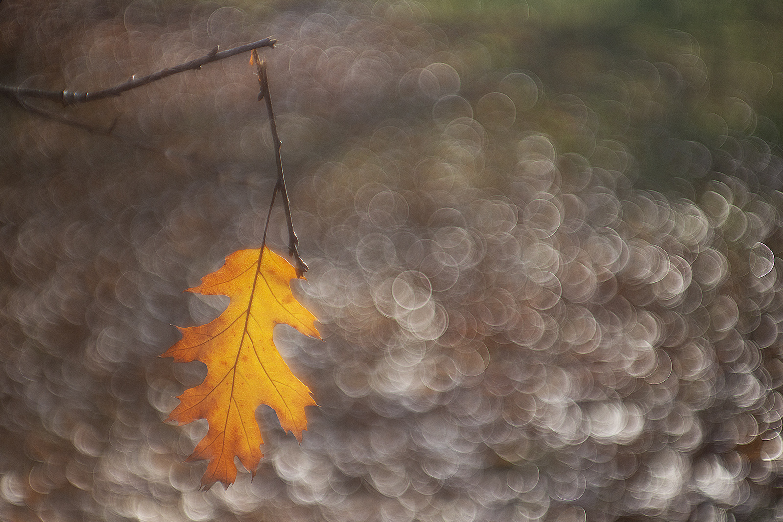 | bella la luce morbida che illumina la foglia che ci permette di godere del suo bel colore giallo arancio dell'autunno. Molto bello lo sfuocato intenso oltre essa con questa miriade di luci parassiti a cerchi concentrici. per me una immagine soft e molto suggestiva. Bravo. Ciao, Tiziano |