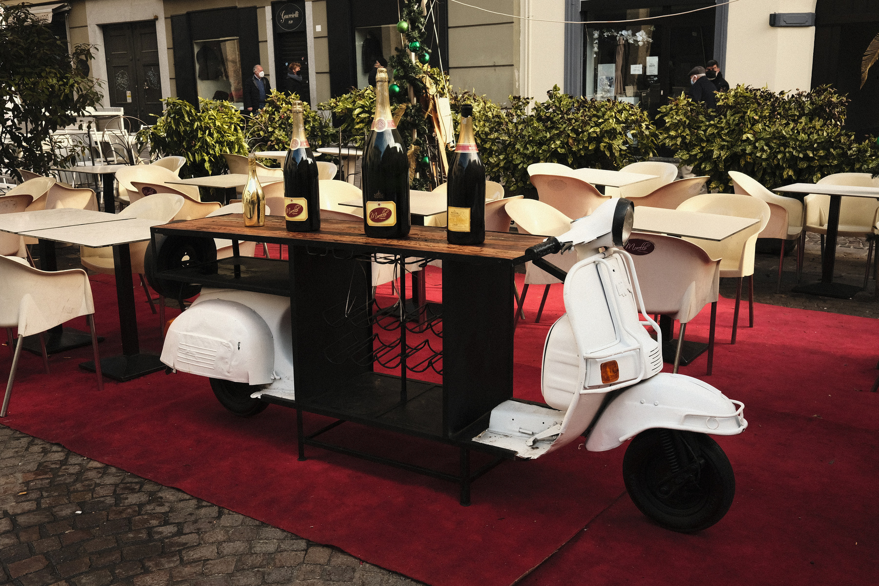 Fantastica l'idea della vespa che tiene il tavolo per l'esposizione di grandi Spumanti.. Hai colto una fantastica immagine.