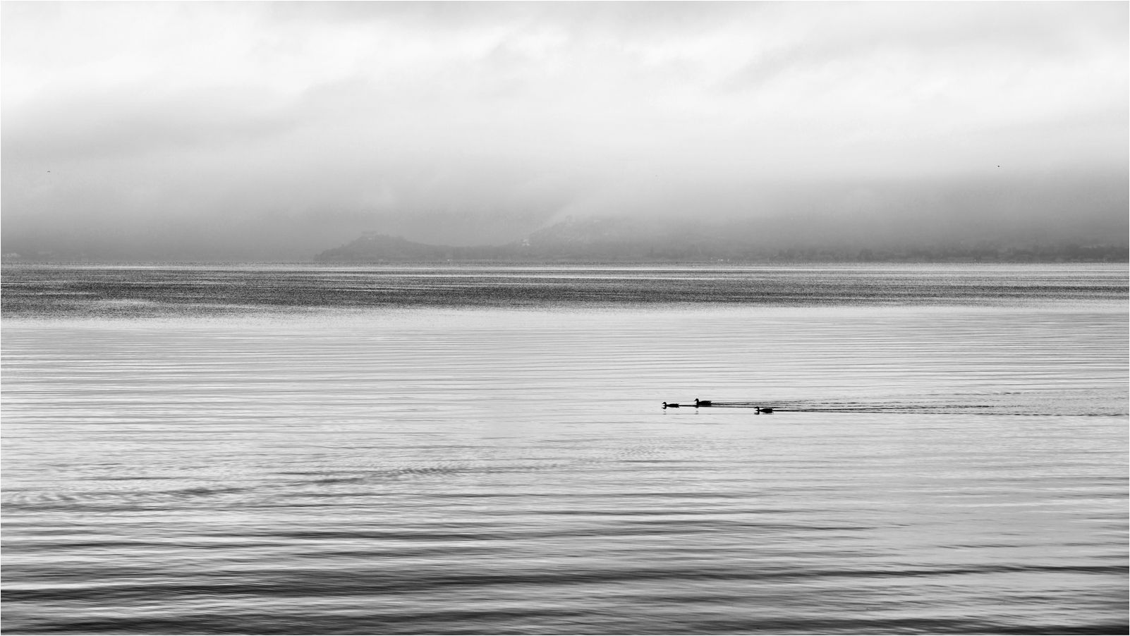 Acque poco mosse come introduzione allo scatto, tre anatre, una striscia di mare di colore più intenso, e sullo sfondo confuse tra la nebbia accenni di profili montuosi. Un bel quadretto _________________ Giuseppe |