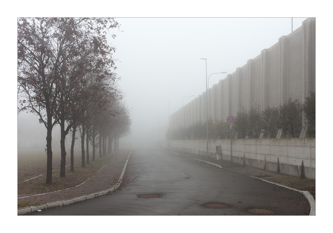 Bella questa immagine sospesa tra angoli silenziosi di una città coperta di nebbia.