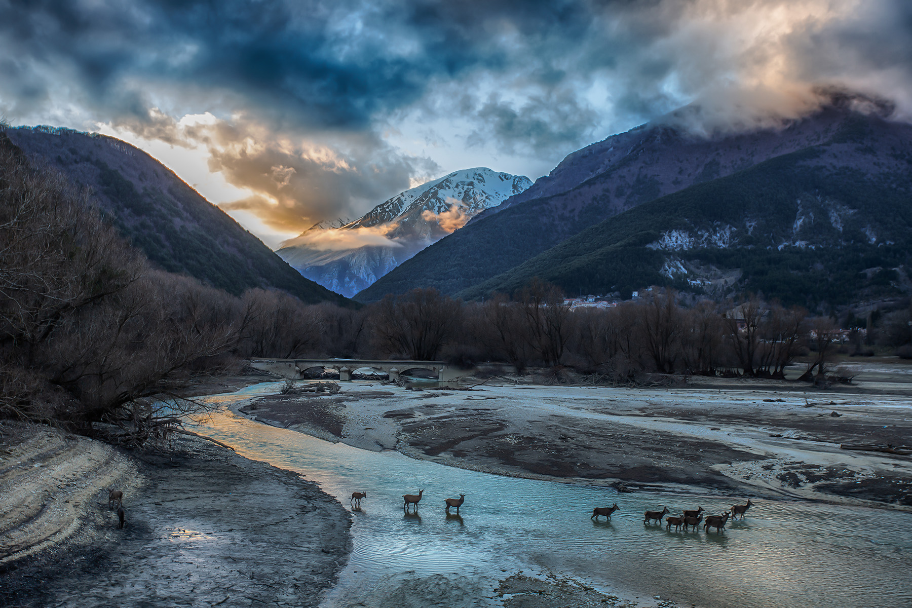 A mio avviso molto migliore della precedente! Ripresa più ampia, atmosfera naturale, con una tonalità argentea che trasmette perfettamente il freddo del momento, e poi i cervi che attraversano il fiume numerosi… Bellissima, complimenti!