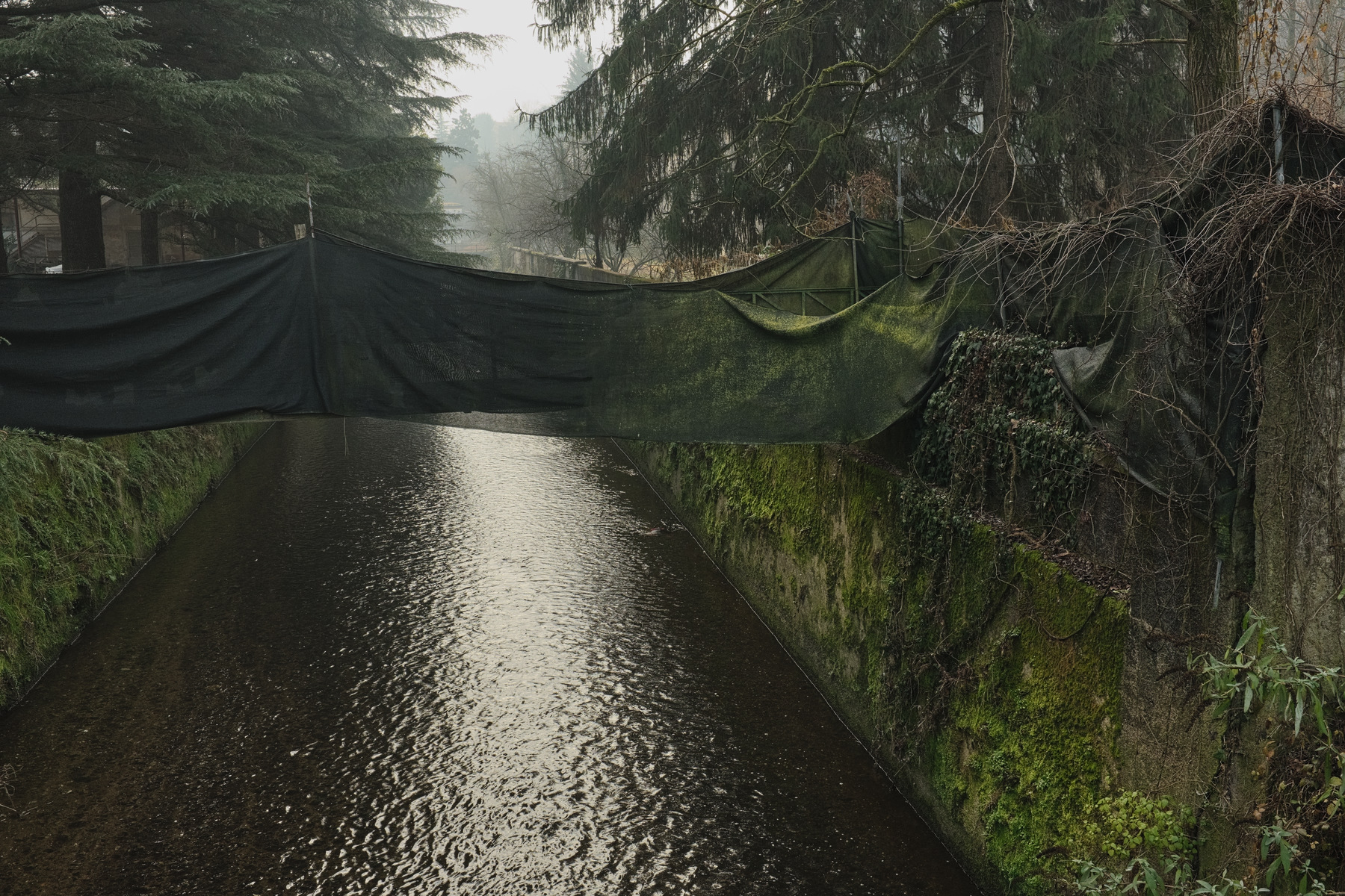 Un telo a protezione sul ponte per lavori imminenti o passati… Ma quello che maggiormente mi colpisce sono le assonanze cromatiche su materie diverse ma tutte sui toni del verde… Bella anche la luce sull’acqua e la resa delle sponde