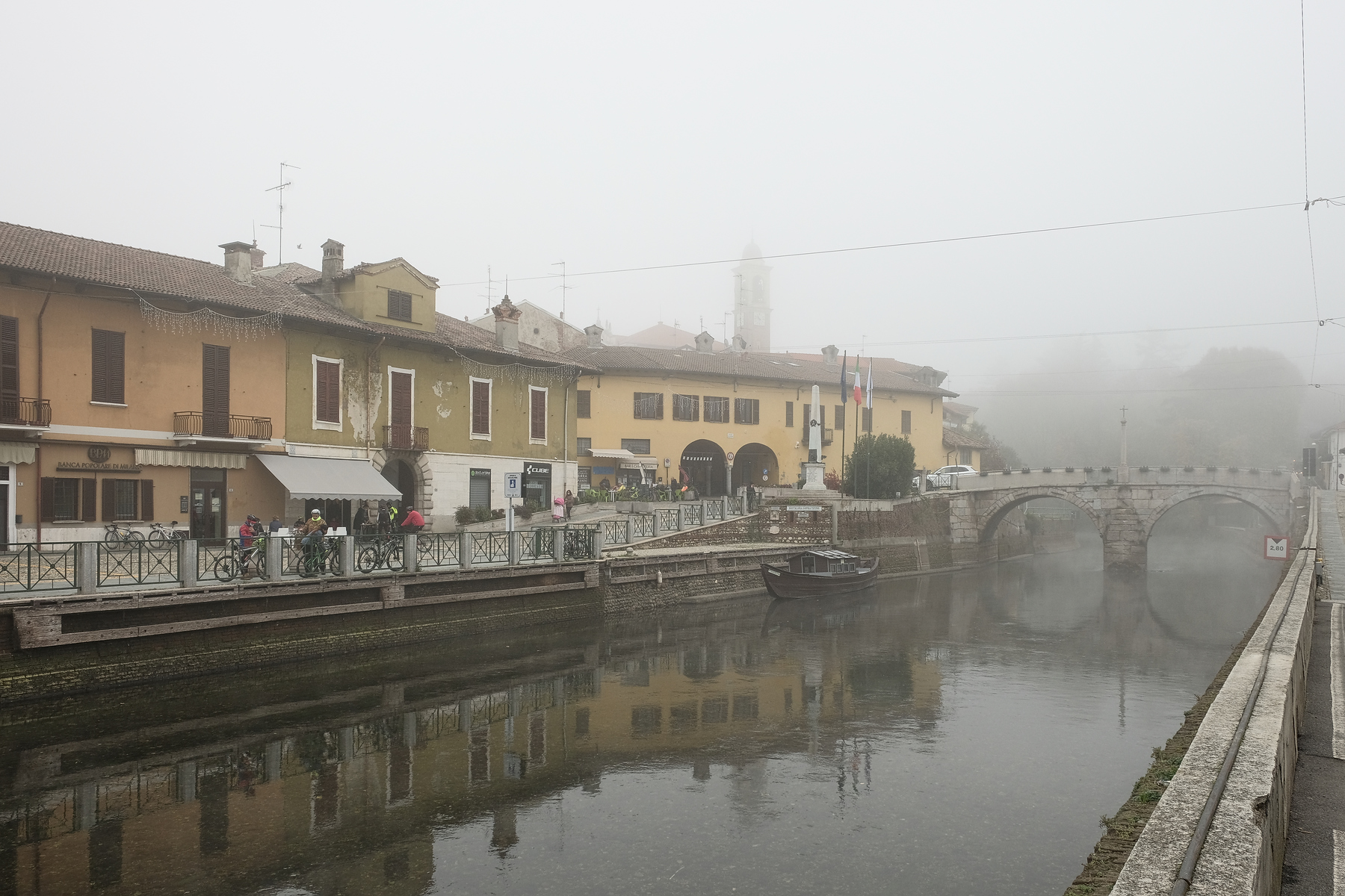 Ciclisti, clienti al bar, la chiatta, oltre alla nebbia che non poteva mancare.