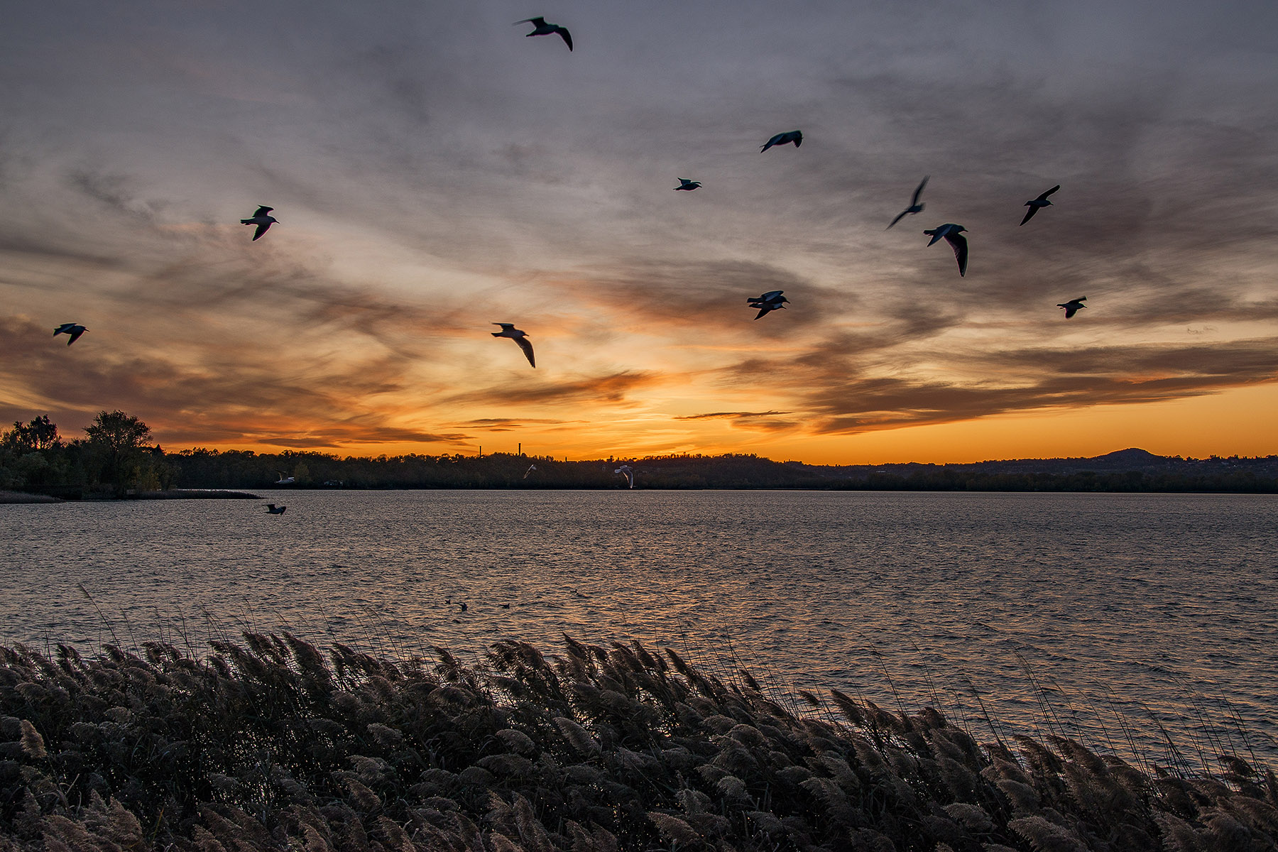 Bella questa quinta di cannucce di palude (Phragmites australis) che fa da primo piano alla distesa lacustre sotto un cielo di fuoco solcato dai gabbiani.