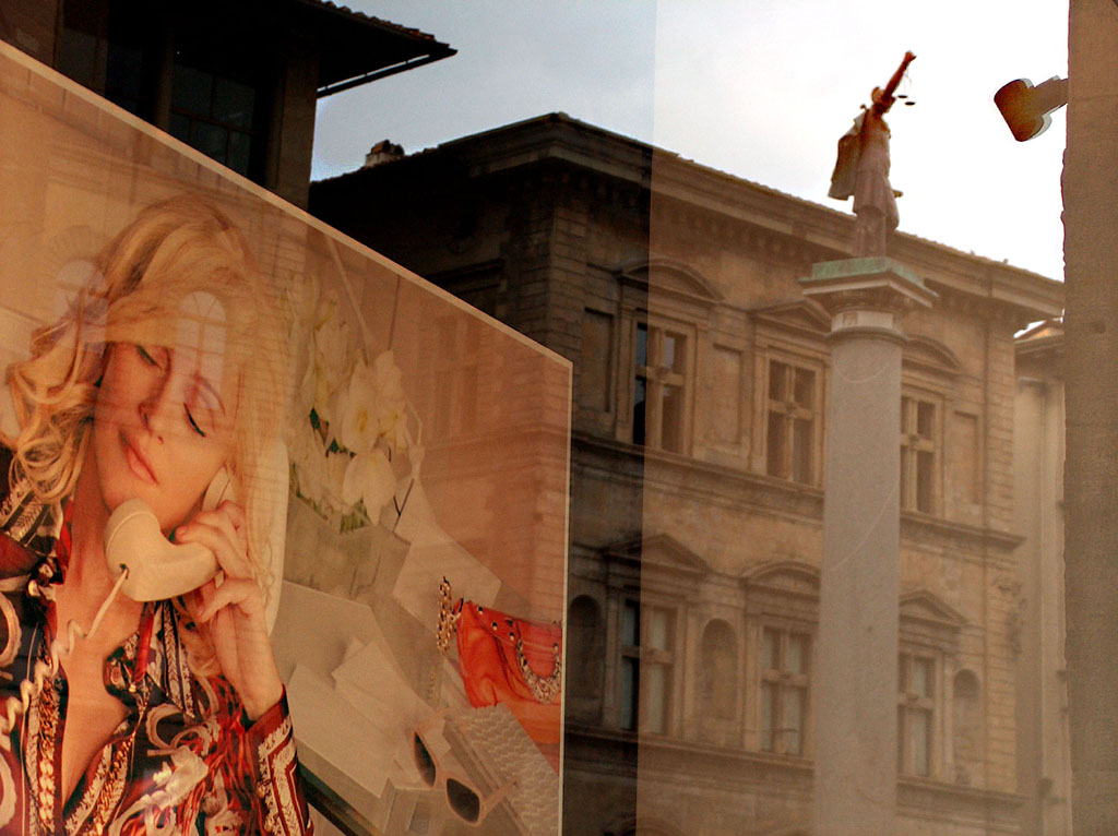Una citazione televisiva immersa in un bel gioco di trasparenze, sullo sfondo le opere d'arte e le case vecchie di secoli, come a suggerire la vacuità del mondo dello spettacolo. Un bello scatto, ti consiglierei di eliminare in Photoshop il faretto in alto a destra.