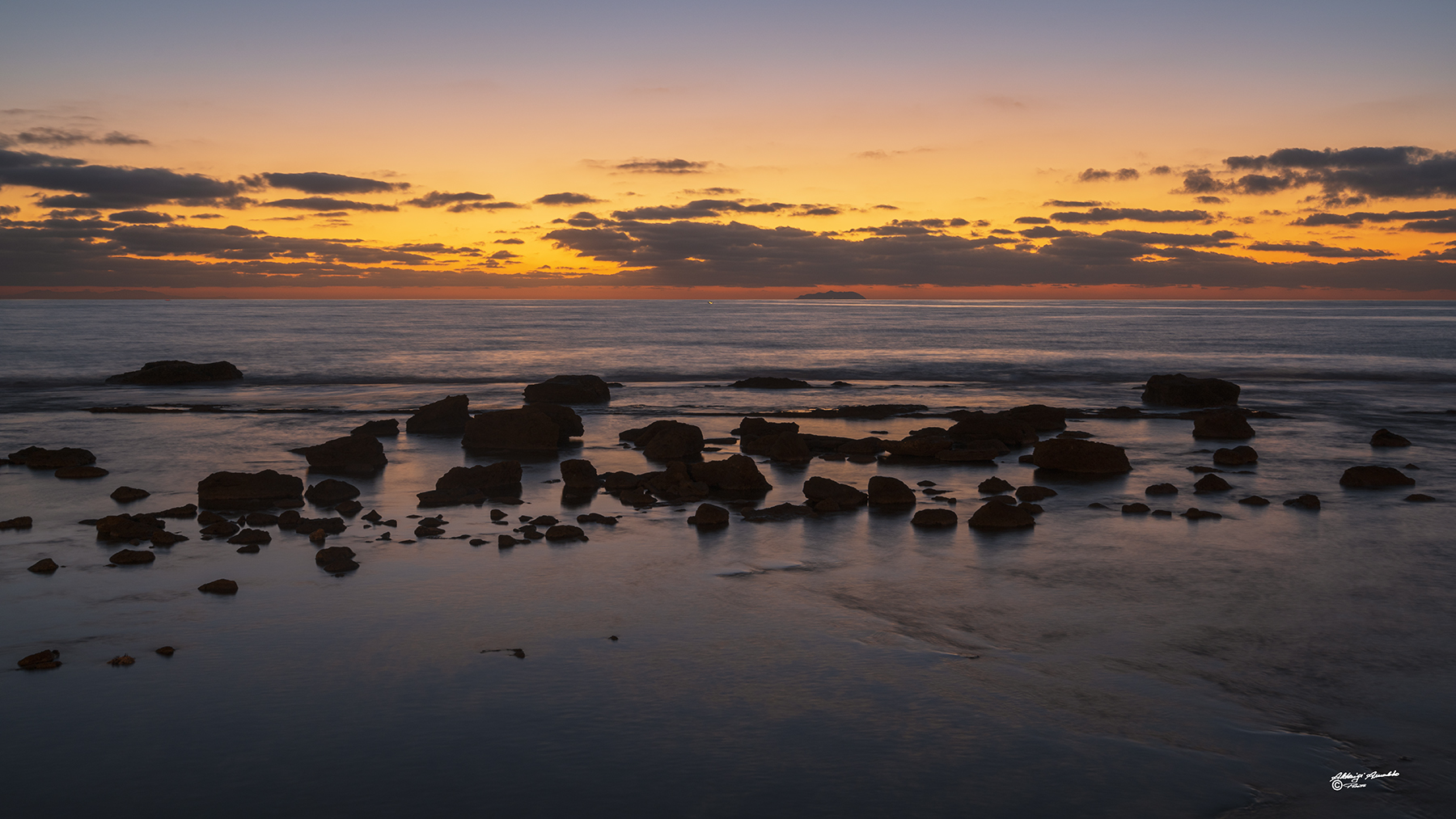 Splendidi i colori dell'imbrunire e le nuvole che si addensano sullo sfondo. Mentre il primo piano è movimentato da una serie di massi e da una bella luce che si riflette sull'acqua a supportare questa bella immagine