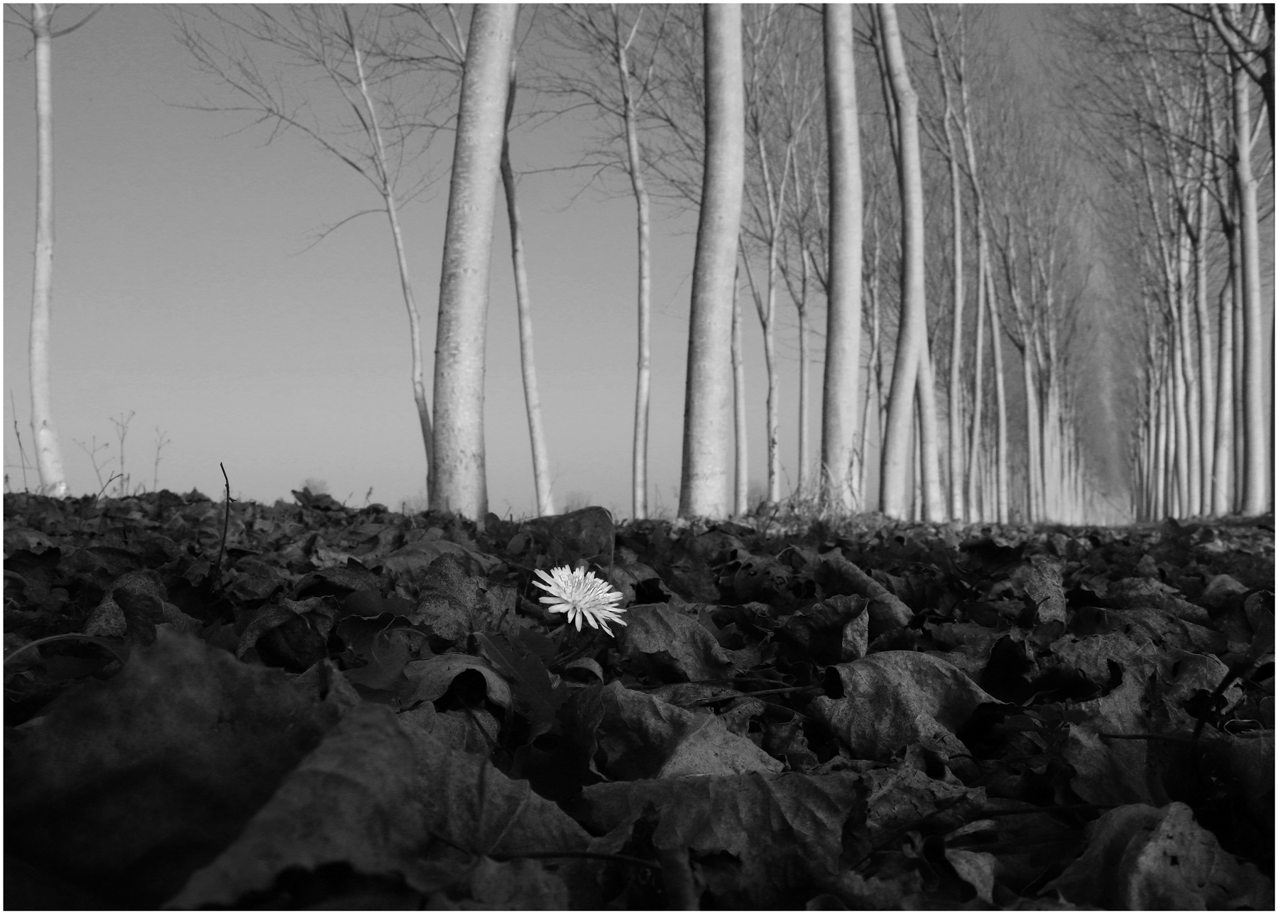 Un’immagine di contrasti… Il tappeto di foglie così cupo, gli alberi chiari e sfocati, quasi evanescenti, il fiorellino, del tutto estraneo al contesto, che sbuca e spariglia prendendosi il ruolo di protagonista… Una combinazione originale e interessante