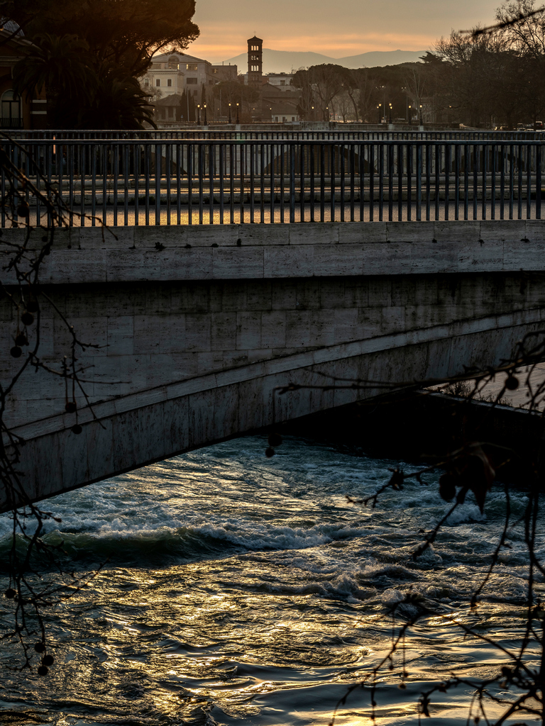 Bravo Danilo, che ti muovi all’alba per creare immagini con questa bellissima luce Sembrano quasi due foto in una, in alto la calma rosata di un mattino romano, in basso l’impeto del fiume, in cui l’acqua raffredda anche i colori… A me piace il formato verticale, lo trovo adeguato alla scena, un po’ meno i rami in primo piano, ma lì c’era poco da fare… Per me una buona proposta