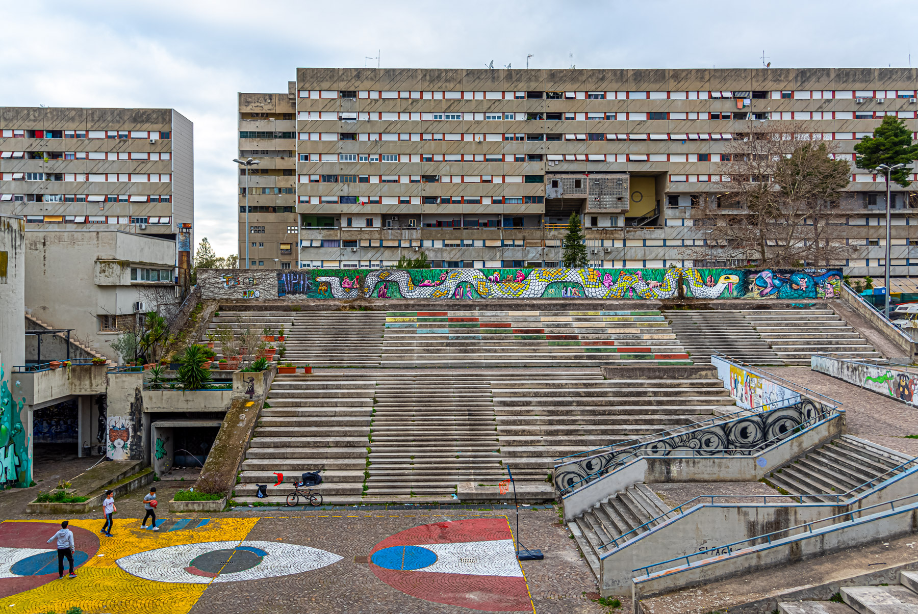 Molto bella Aldo… Mi piace infinitamente di più della precedente, che sì contestualizzava ma rimaneva più estranea, mentre in questa c’è l’anima del luogo… Il palazzo gigantesco, certo, ma anche uno spazio di aggregazione, i ragazzi che giocano, i murales colorati, la vita vera.