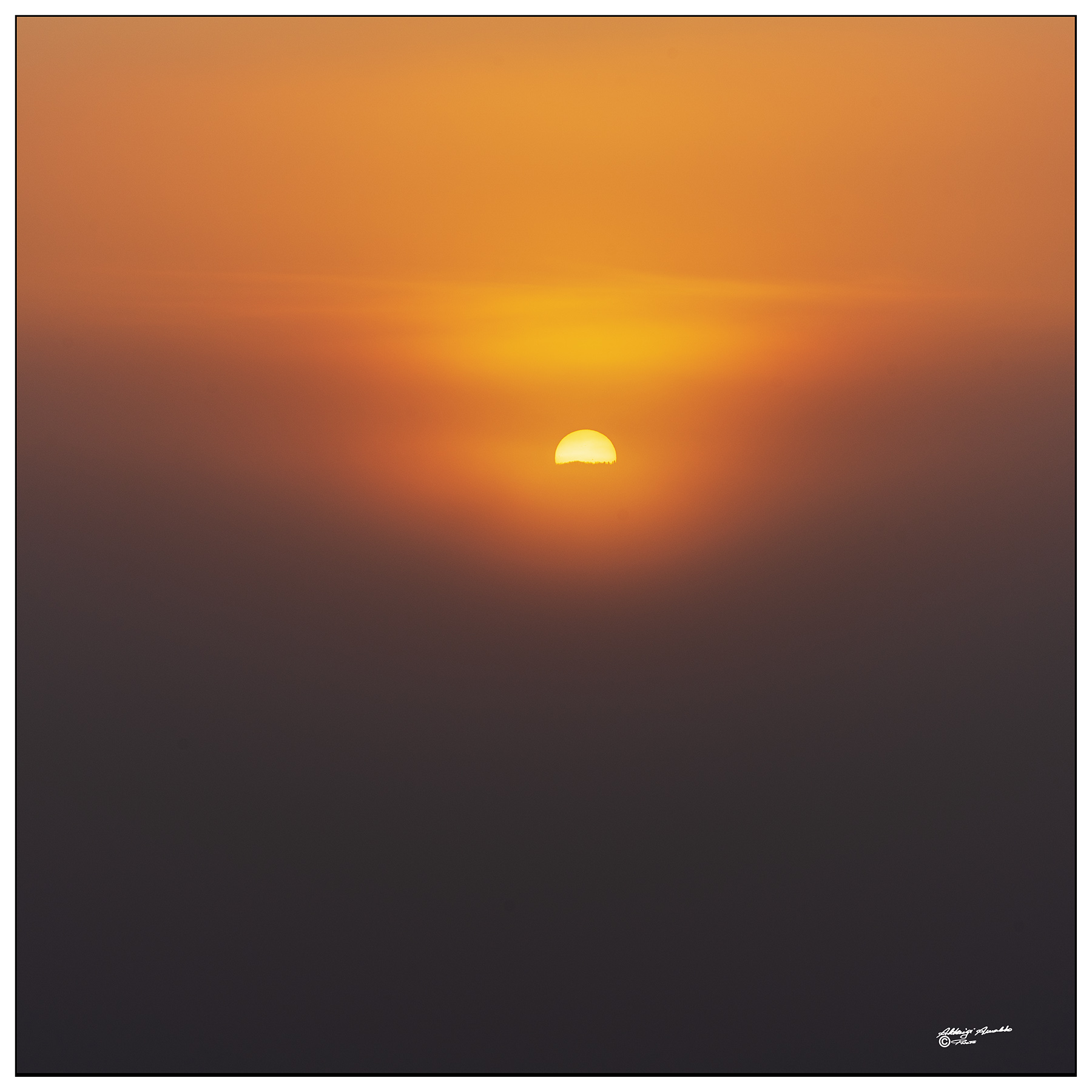 Quel che mi piace particolarmente è l'assoluta placidità ed essenzialità della scena. Il Sole nel suo splendore immerso nell'atmosfera circostante, tagliato a metà e avvolto in mille sfumature calde e suadenti.