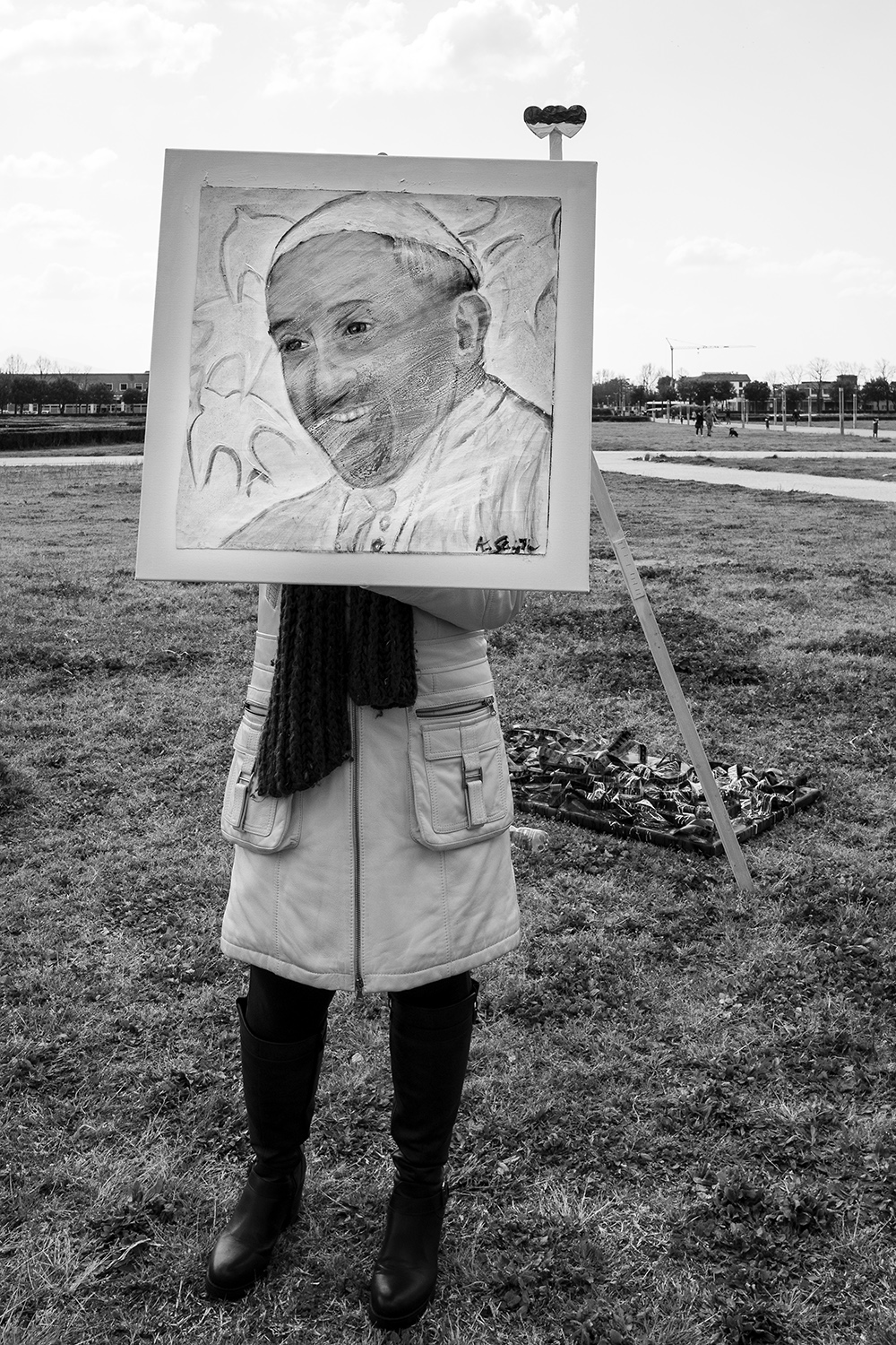 Il ritratto di papa Francesco e sotto la gonna che ricorda lontanamente l'abbigliamento del pontefice