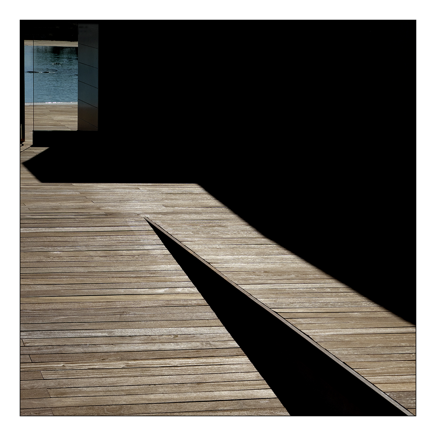 Andamento diagonale ed esposizione che trasforma l'ombra in materia solida come il legno dell'impiantito...