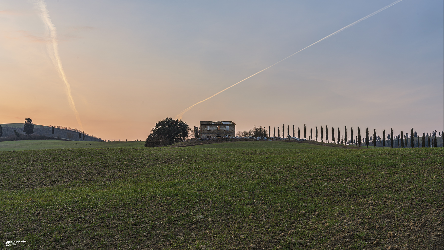 A me piace la composizione, ma contrariamente al tuo solito trovo che stavolta non ci sia molta nitidezza sul casolare… Belle le scie nel cielo