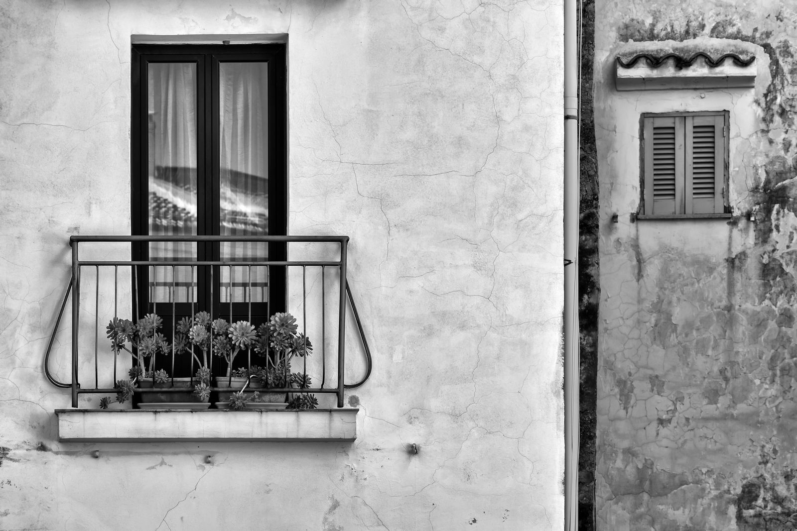 bella la resa dei toni del bianco e nero e deliziose quelle piante grasse sul davanzale come un leggero sorriso.