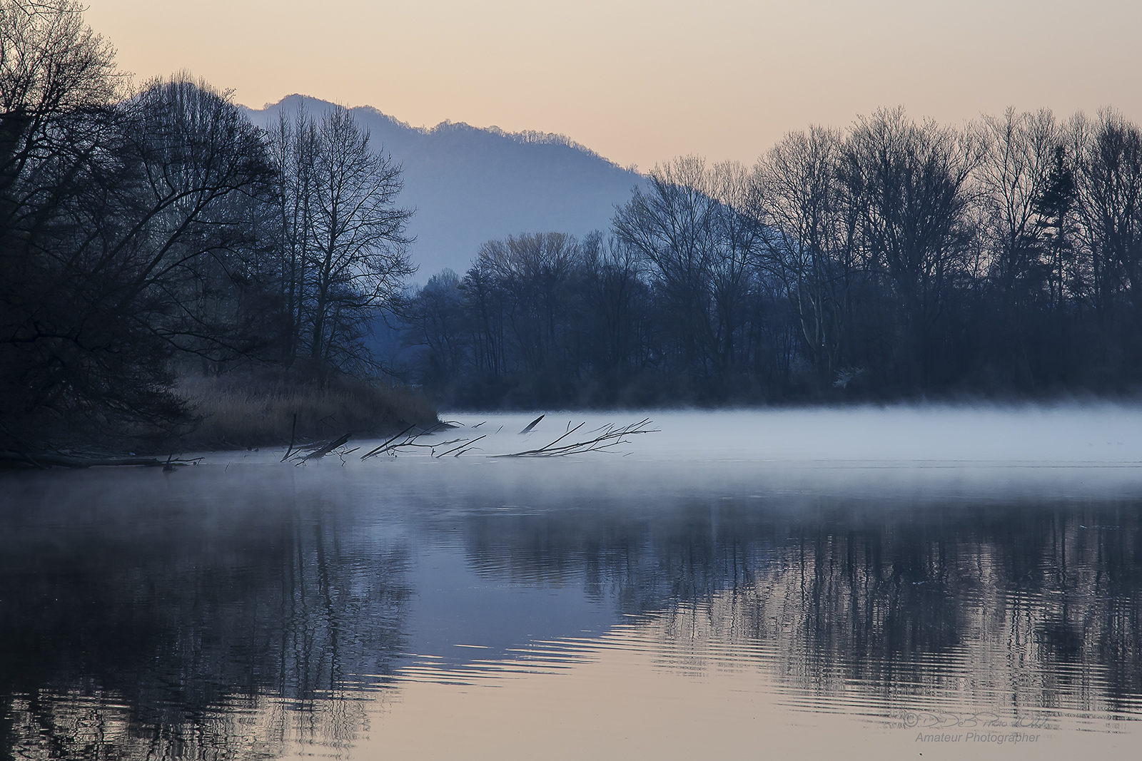 Atmosfera dai toni freddi come fredda è l'atmosfera resa. Deliziosi i rami che emergono dalle acque stagliandosi sulla bassa foschia.
