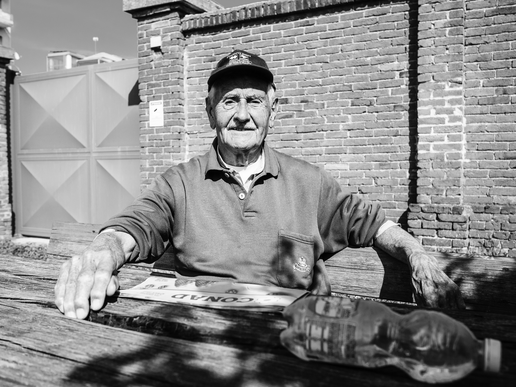 L'ambientazione poco curata da un senso di spontaneità alla scena, anche se la bottiglia avrei fatto in modo di levarla via. Mi piace questo signore, sa di quelle persone che hanno sempre una battuta pronta, un aneddoto da raccontare, un modo per saper mettere a proprio agio l'ascoltatore, perchè qui si, avete ''lavorato'' bene uno sull'altro per creare sintonia , questo è quello che mi immagino. La luce non era certo delle migliori, ma a volte bisogna accontentarsi.
