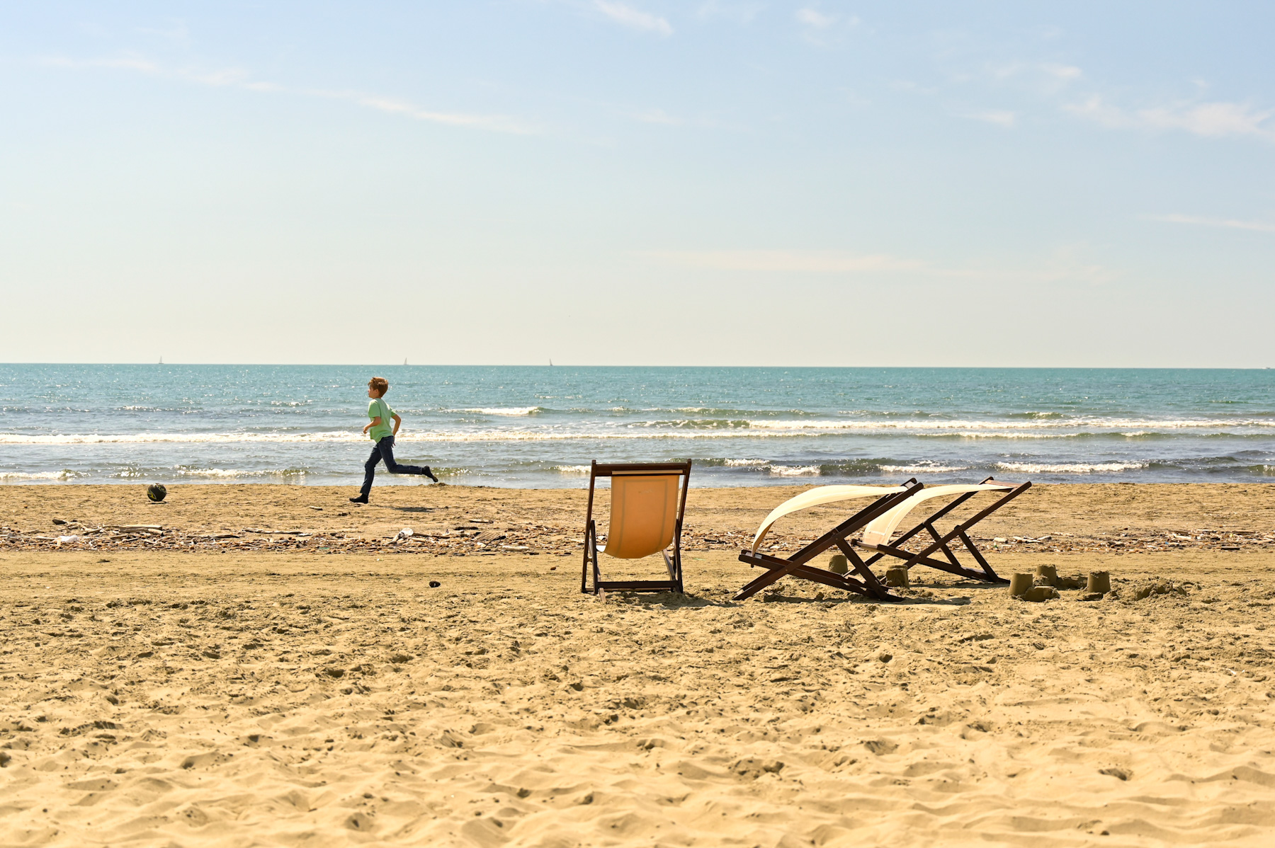 simpatica, il telo degli sdrai ci da il riferimento della folata di vento ed il bambino che rincorre la palla catturata dal vento...