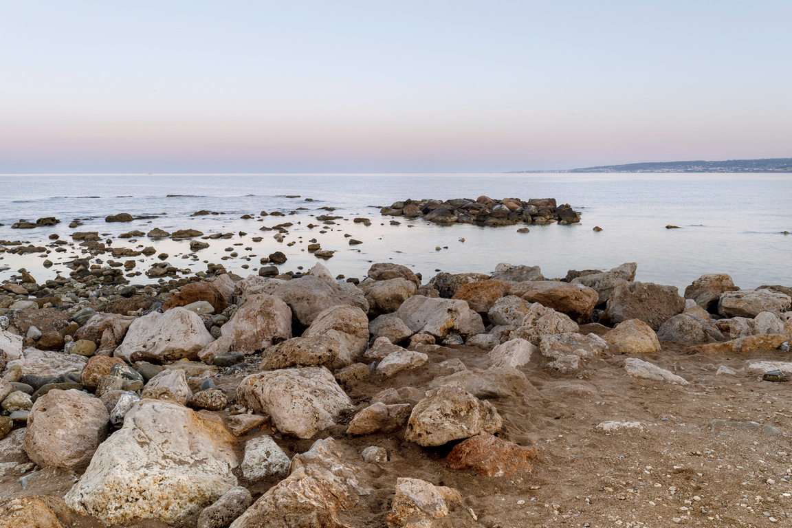 Un bel paesaggio marino tra dura roccia e velato orizzonte.