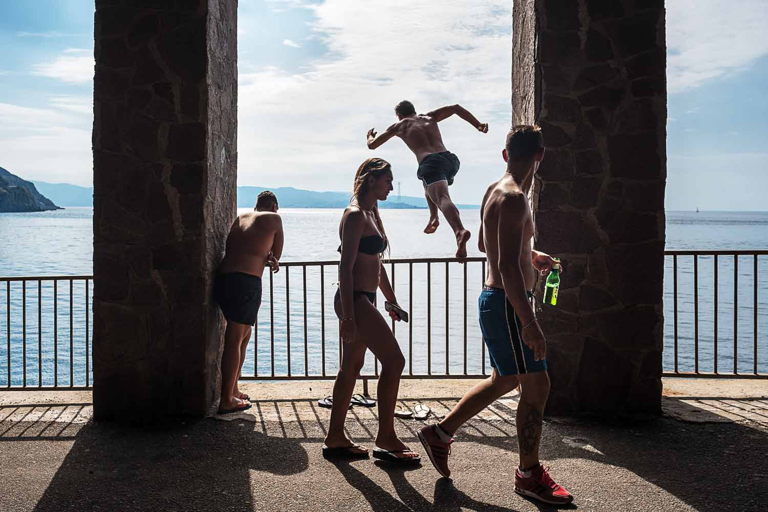 Il tuffatore che corre su una pista immaginaria, la passante dritta e indifferente, lo spettatore appoggiato che però non guarda, e infine il ragazzo con la birra che brilla che lancia uno sguardo distratto.