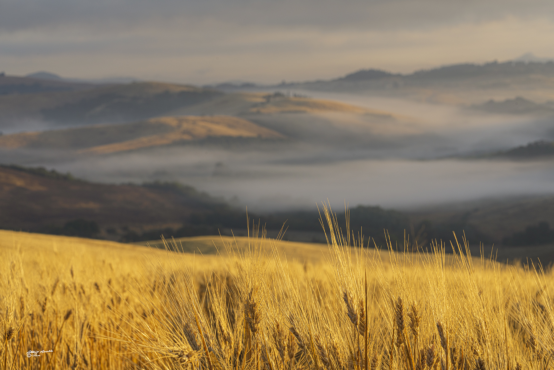 Tutta la presenza di una semplice spiga di grano maturo nel contesto di un ampio panorama di colline toscane ancora scaldate dal colore delle ultime luci solari.
