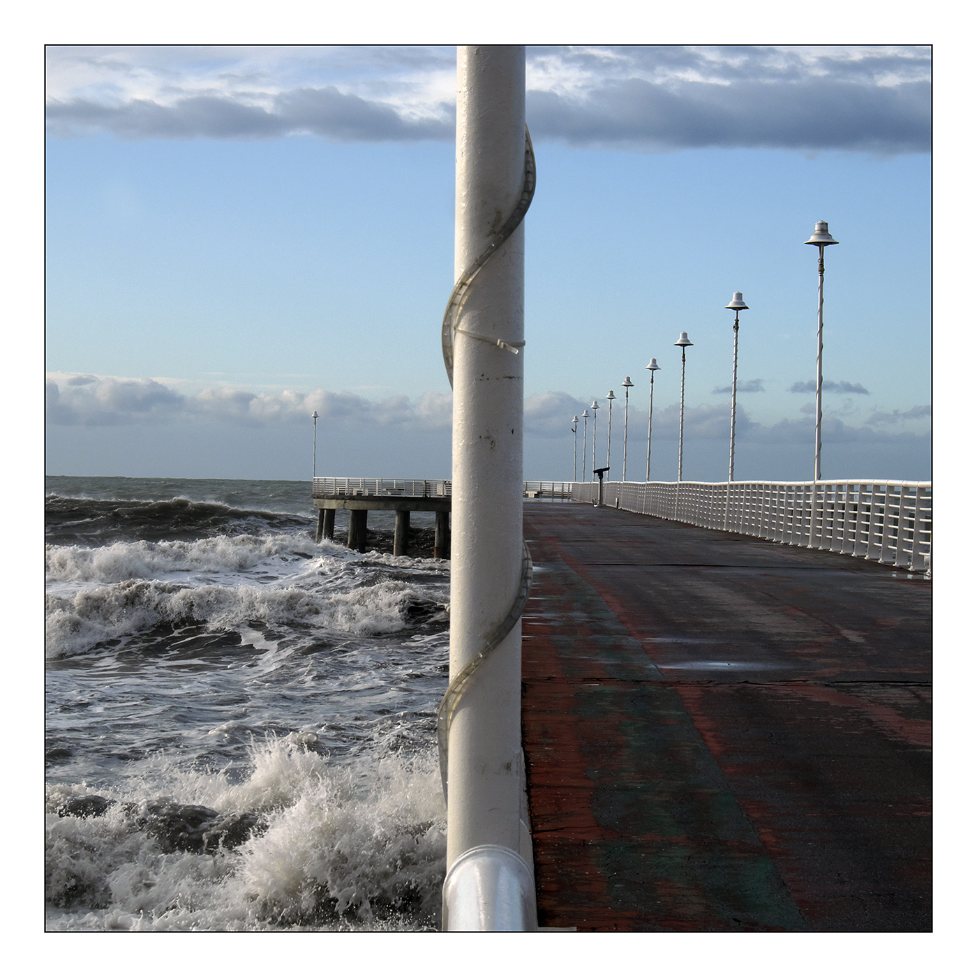 Bella la ripresa del mare agitato che si abbatte sui sostegni del pontile. Piacevole composizione e colori.