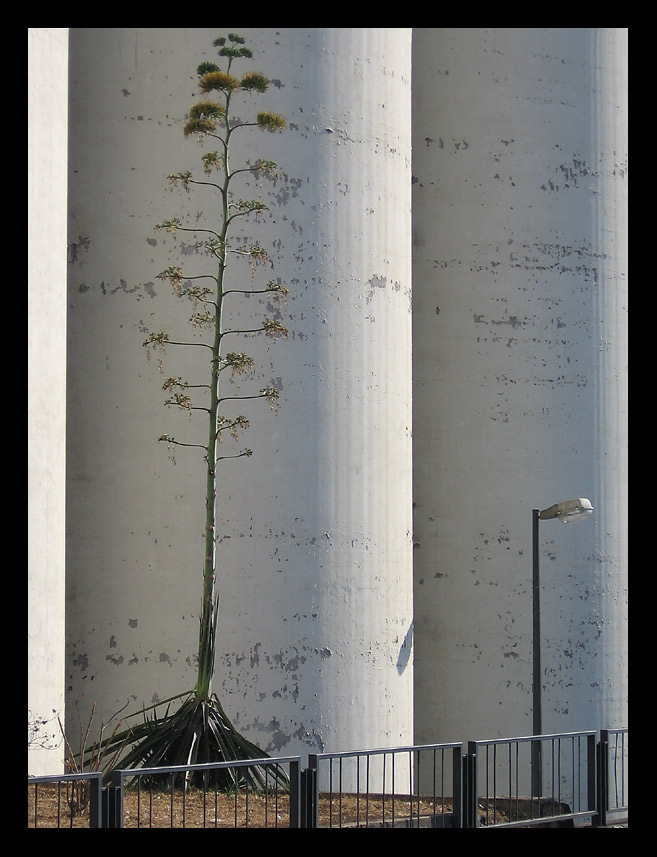 Il fiore dell'agave (forse la mia seconda pianta preferita ) è spettacolare, e la tua inquadratura mi piace perchè dissimula un elemento tanto grosso su uno sfondo che lo è ancora di più.