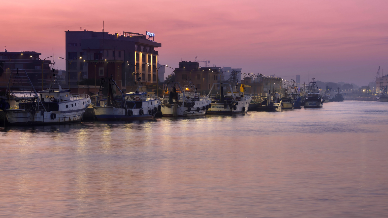 Il porto canale con le barche ferme crea una patina malinconico-industriale che si accompagna benissimo con la luce.