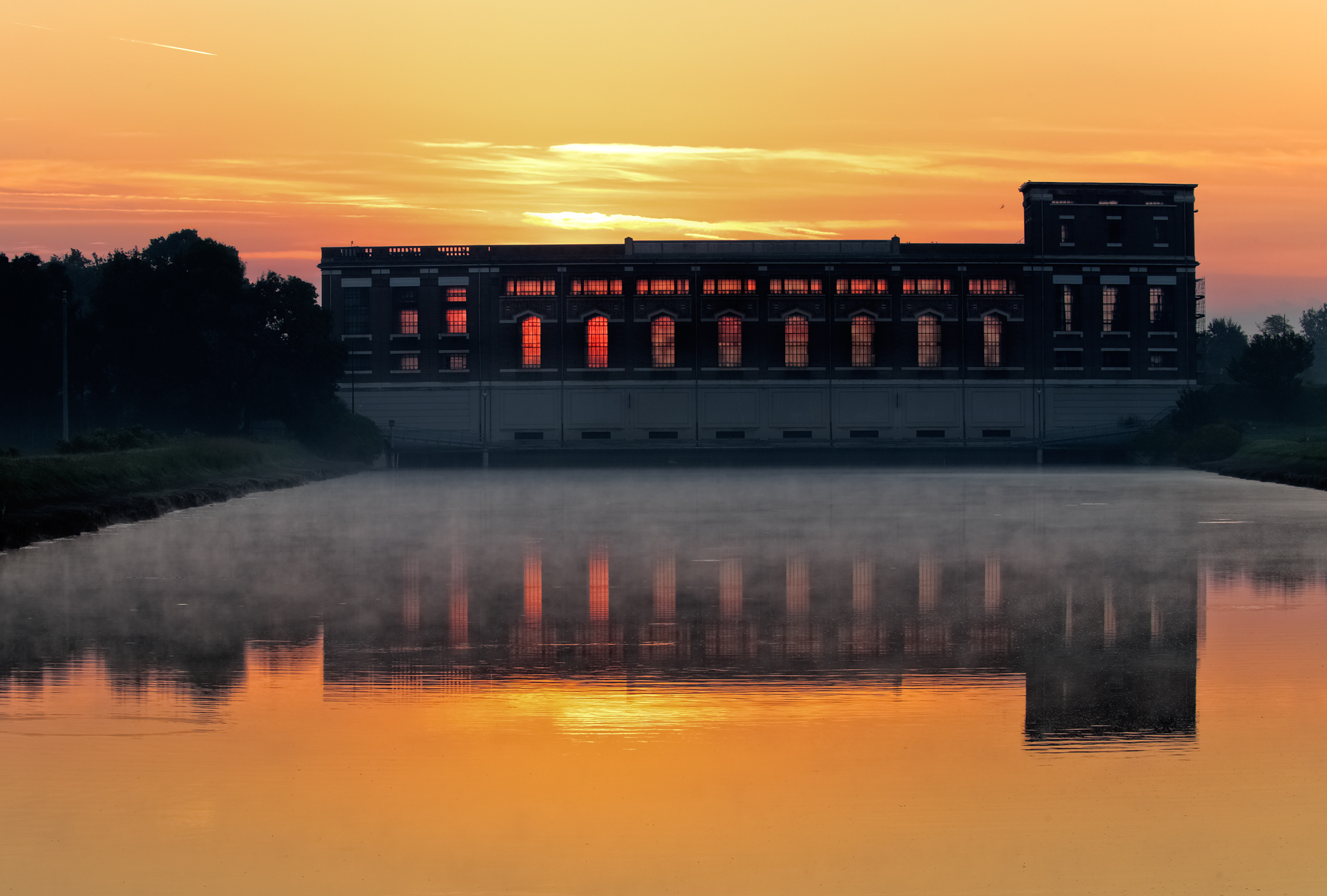Suggestiva la bruma che sale dall'acqua così come il rossore di fuoco che filtra da dietro la diga. Atmosfera magica. Mi piace