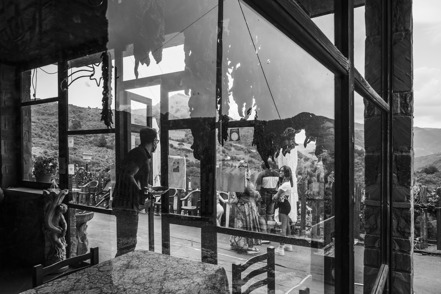 Un bellissimo dentro-fuori con sguardi che si incontrano e riflessi che donano un tocco di magia a questa interessante e descrittiva immagine.Ottimo,come sempre,il bn. Ciao,Sergio.