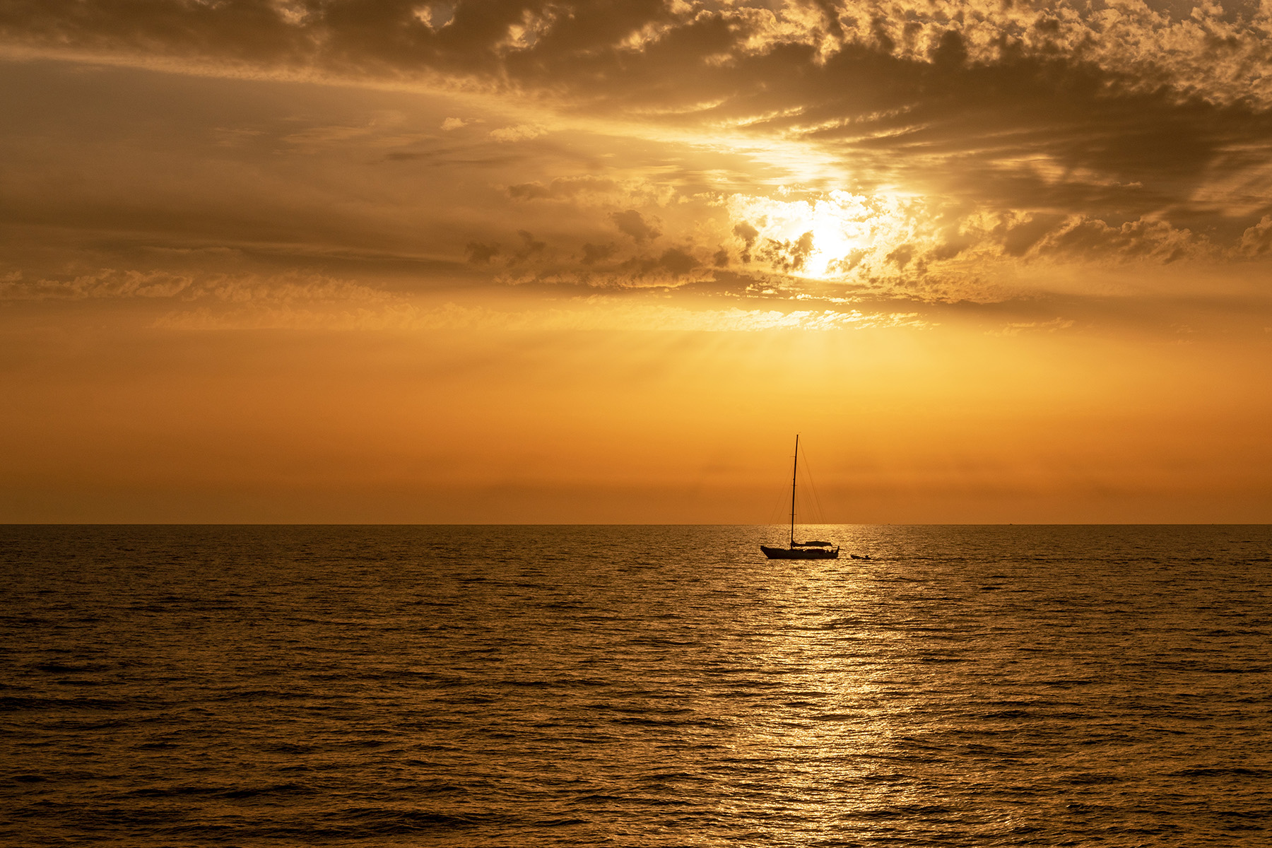 un mare dorato ed una solitaria barca a vela che si gode lo spettacolo di questa luce