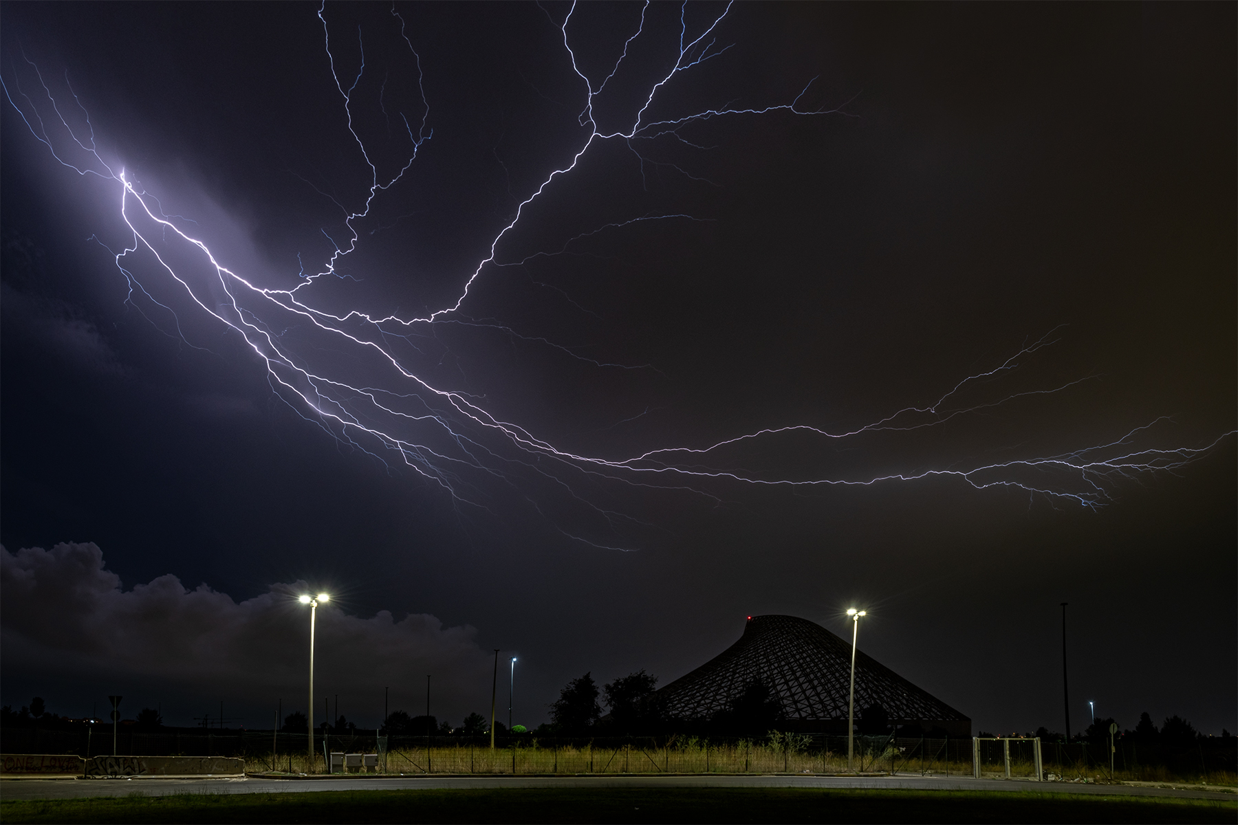 Questo gruppo di fulmini ci ha colti di sorpresa perchè l'attività prima di questi era di fulmini in verticale in lontananza, ci eravamo messi al centro di una rotatoria, le auto passavano e magari si chiedevano cosa stessimo facendo...stava iniziando a piovere, quando ad un tratto il tutto si e' illuminato e sinceramente ho avuto anche un po' di paura perchè era come se volesse prendere tutto l'ambiente circostante. Per fortuna avevo messo l'intervallometro con scatti a 5 e 8 secondi per un tempo di 10 minuti, gli altri a mano, e questo e' stato impresso... Quando l'ho visto sul display non volevo crederci, mi era capitato tempo fa una cosa del genere ma non era stato impresso nella SD....